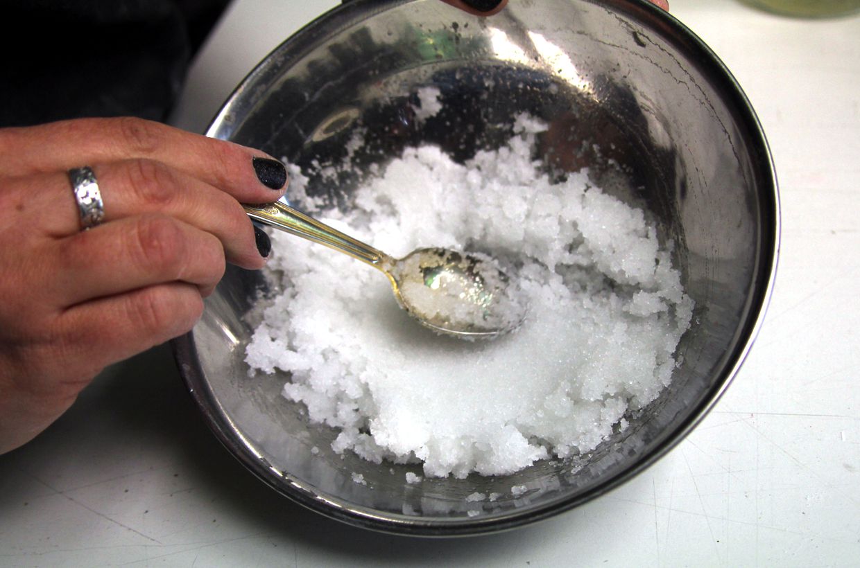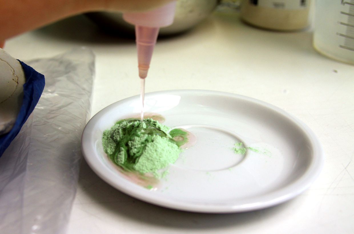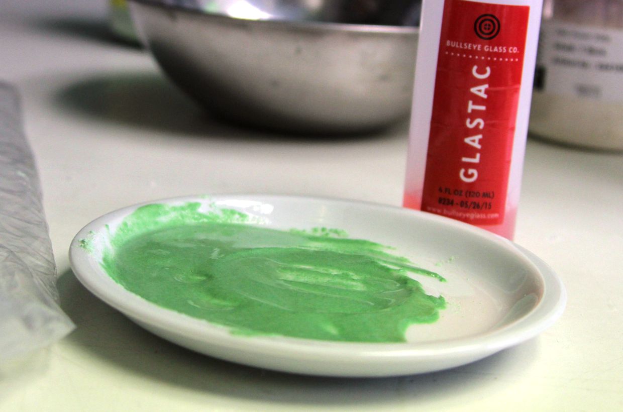 The fine transparent frits are mixed with 2 spoons of water and 1 spoon of CMC. Check the mixture, it must be sticky but not too moist.