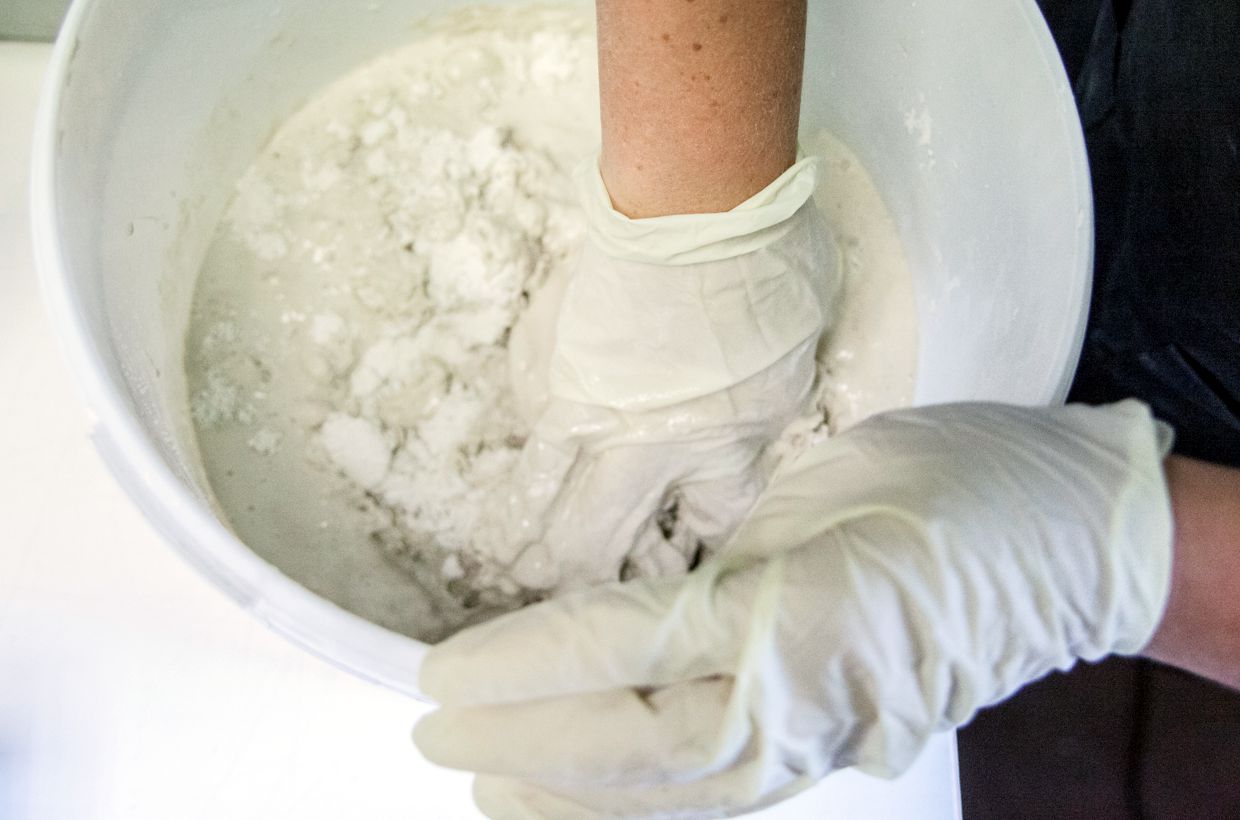 The form is built up in two layers with Crystalcast. Around a clay or wax model (here a semicircular shape) the mixture is applied in 2 steps as a thick paste. The mixture should be firm between the steps!