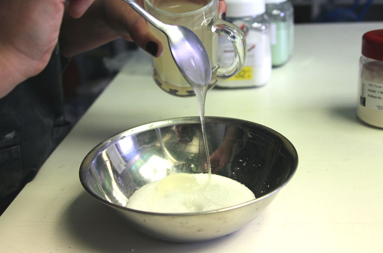 Prepare the CMC: 2 spoons of CMC powder are poured into hot water, then left to swell overnight. The CMC dissolves and becomes a transparent, thick liquid.