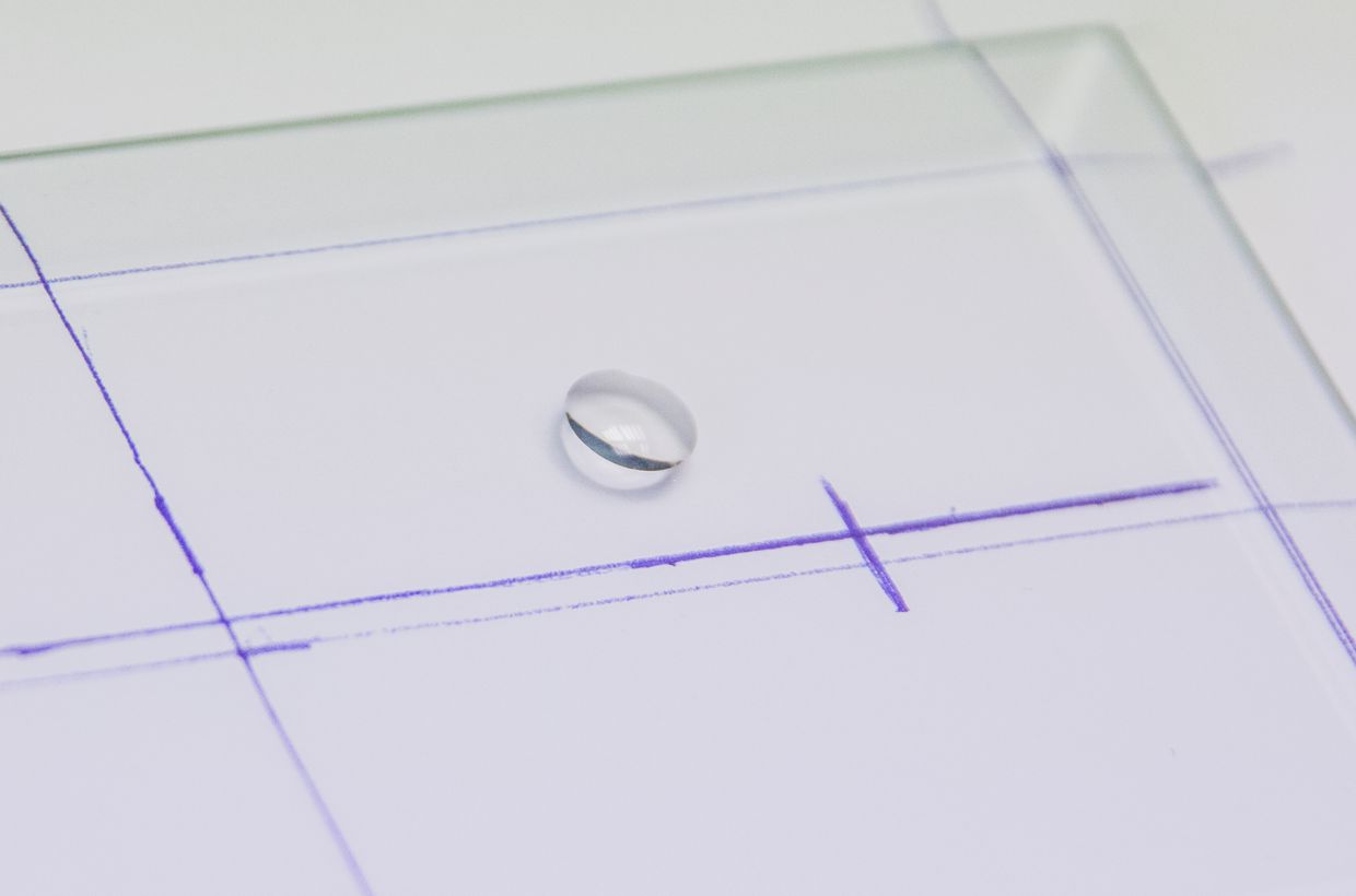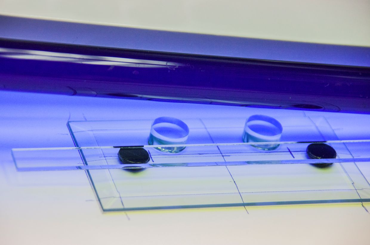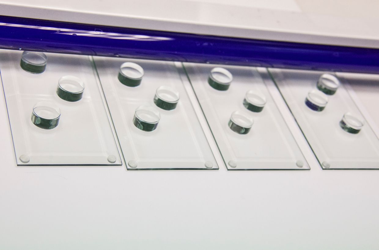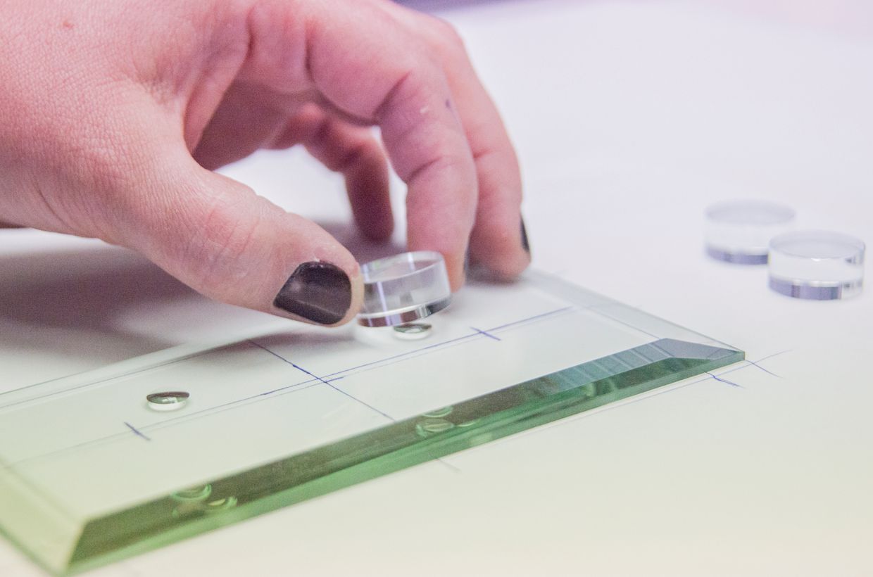 Nun kleben Sie die vordere Ronde genauso auf wie die hinteren beiden. Tipp: Damit Sie am Ende kein Problem mit den Abständen haben, ist es ratsam ein Stück Glas in der Objektstärke zwischen die Ronden zu halten und die vordere Position daran anzupassen. Entfernen Sie den überschüssigen Kleber der letzten Ronde und härten Sie alle Klebestelllen noch einmal für ca. 3-4 Minuten unter der UV-Lampe aus. Im letzten Schritt reinigen Sie die Unterseite und kleben in jede Ecke einen Gummi-Bumpen. Fertig ist Ihr Glasfuß!
