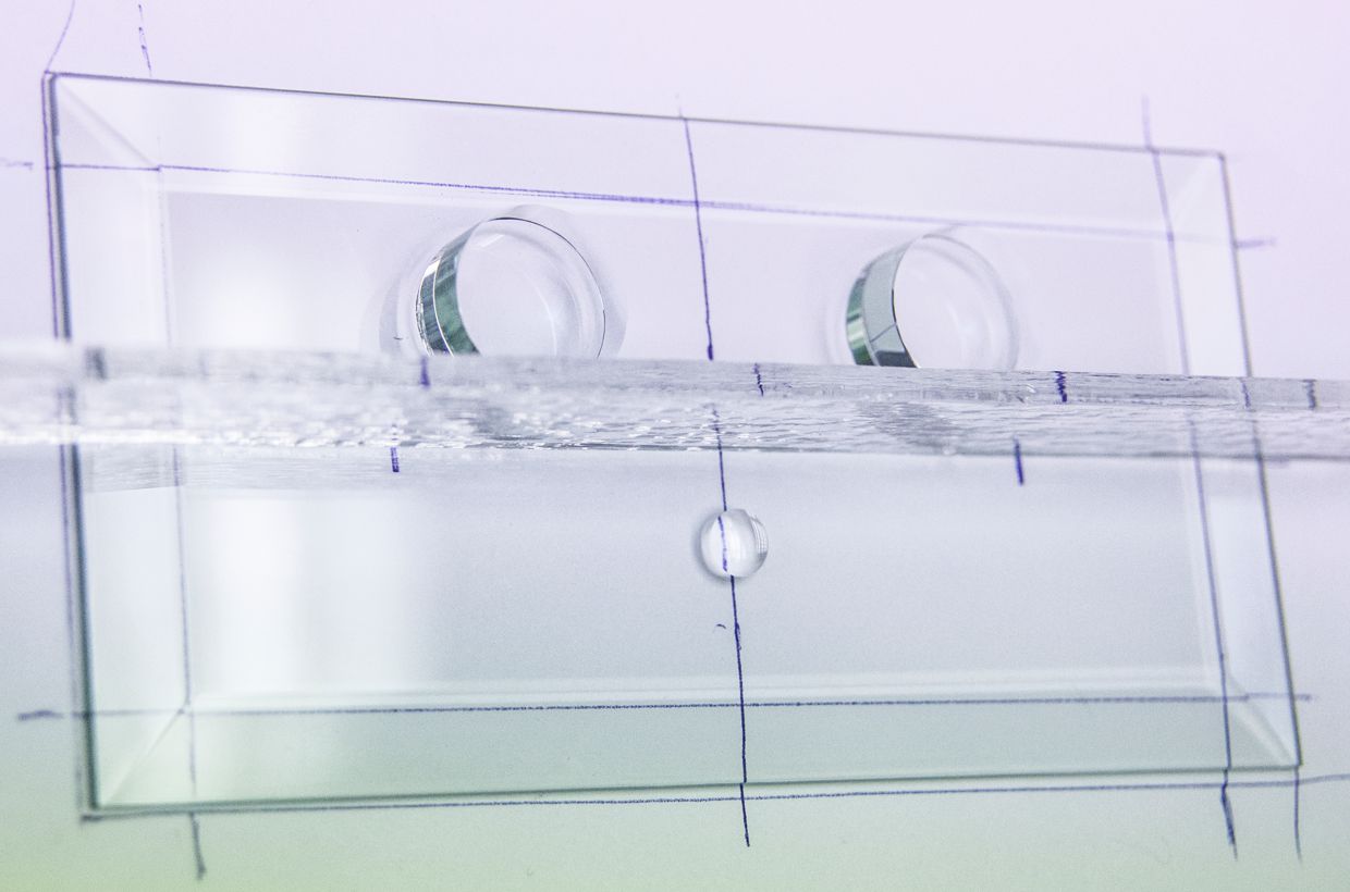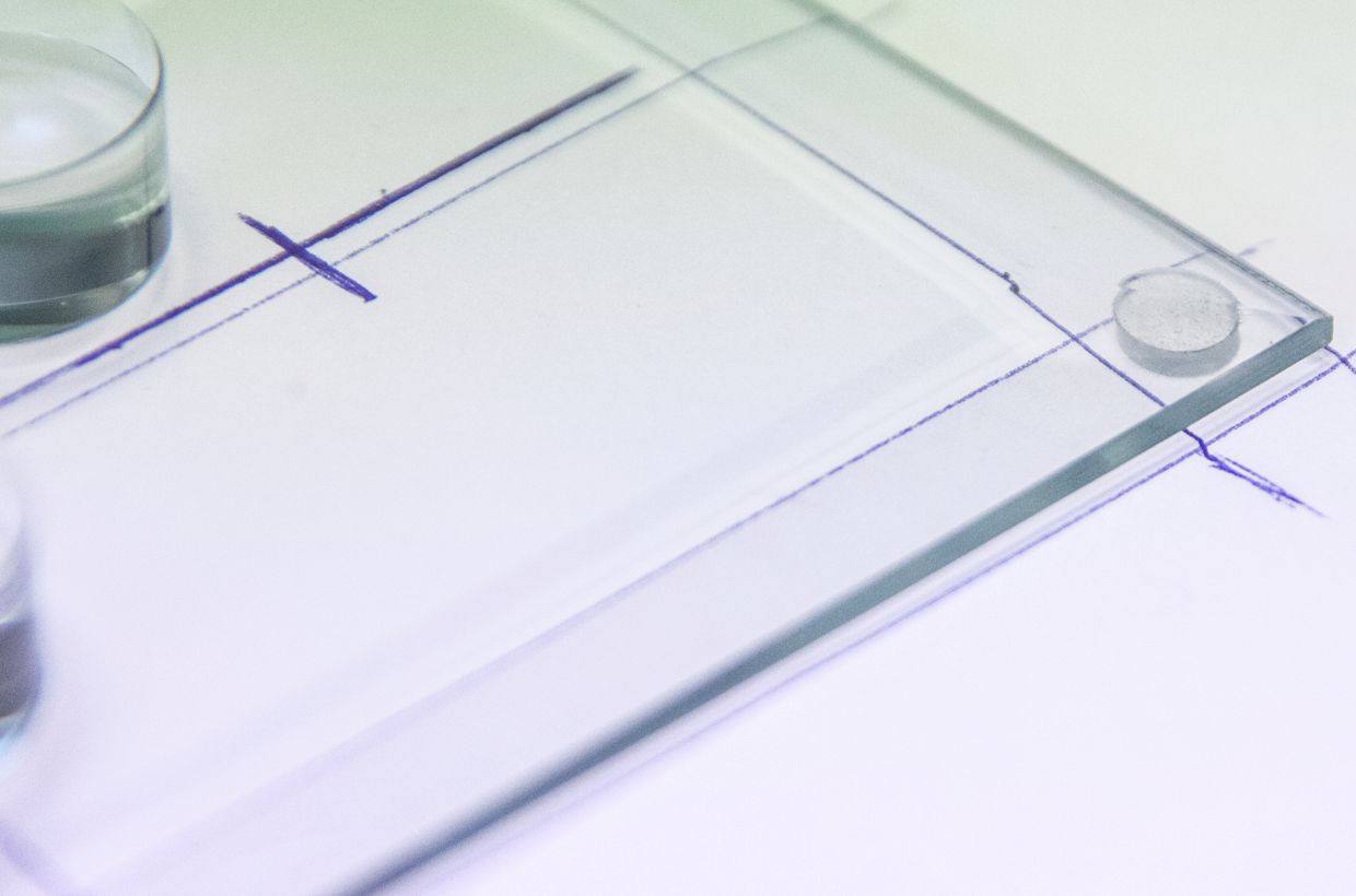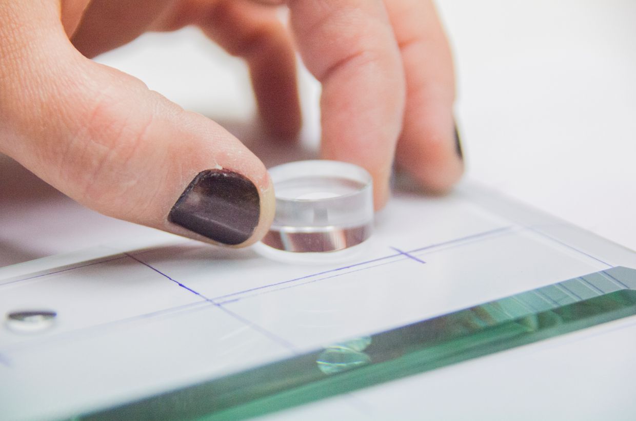 Reinigen Sie den Bevel und die Ronden. Für die weitere Bearbeitung müssen die Komponenten fett- und staubfrei sein. Erstellen Sie sich eine Vorlage entsprechend der Objektstärke und markieren Sie die Stellen an denen Sie die Ronden aufkleben möchten. Jetzt können Sie den Bevel auf die Skizze legen und die hinteren beiden Ronden kleben. Tragen Sie einen Tropfen UV- Kleber an den entsprechenden Stellen auf. Legen Sie die Ronden vorsichtig schräg auf den Bevel und senken Sie sie lansam ab. So vermeiden Sie Lufteinschlüsse im Kleber. Richten Sie die Ronden aus, Sie können einen Glastreifen anlegen um die beiden in einer Linie zu halten. Dann belichten Sie den Kleber für ca. 30-60 Sekunden mit der UV Lampe. Entfernen Sie die überschüssigen Klebereste.