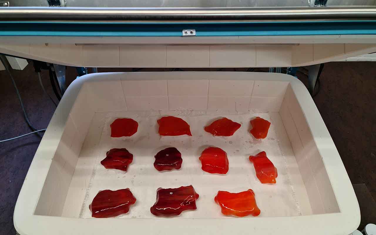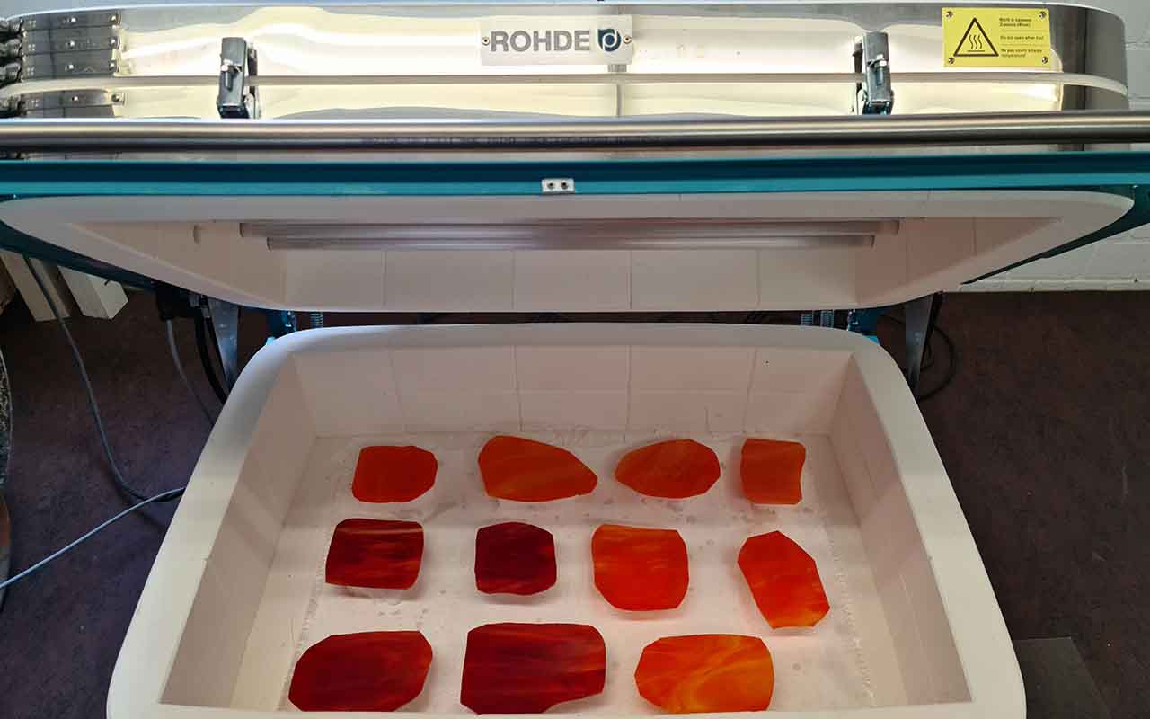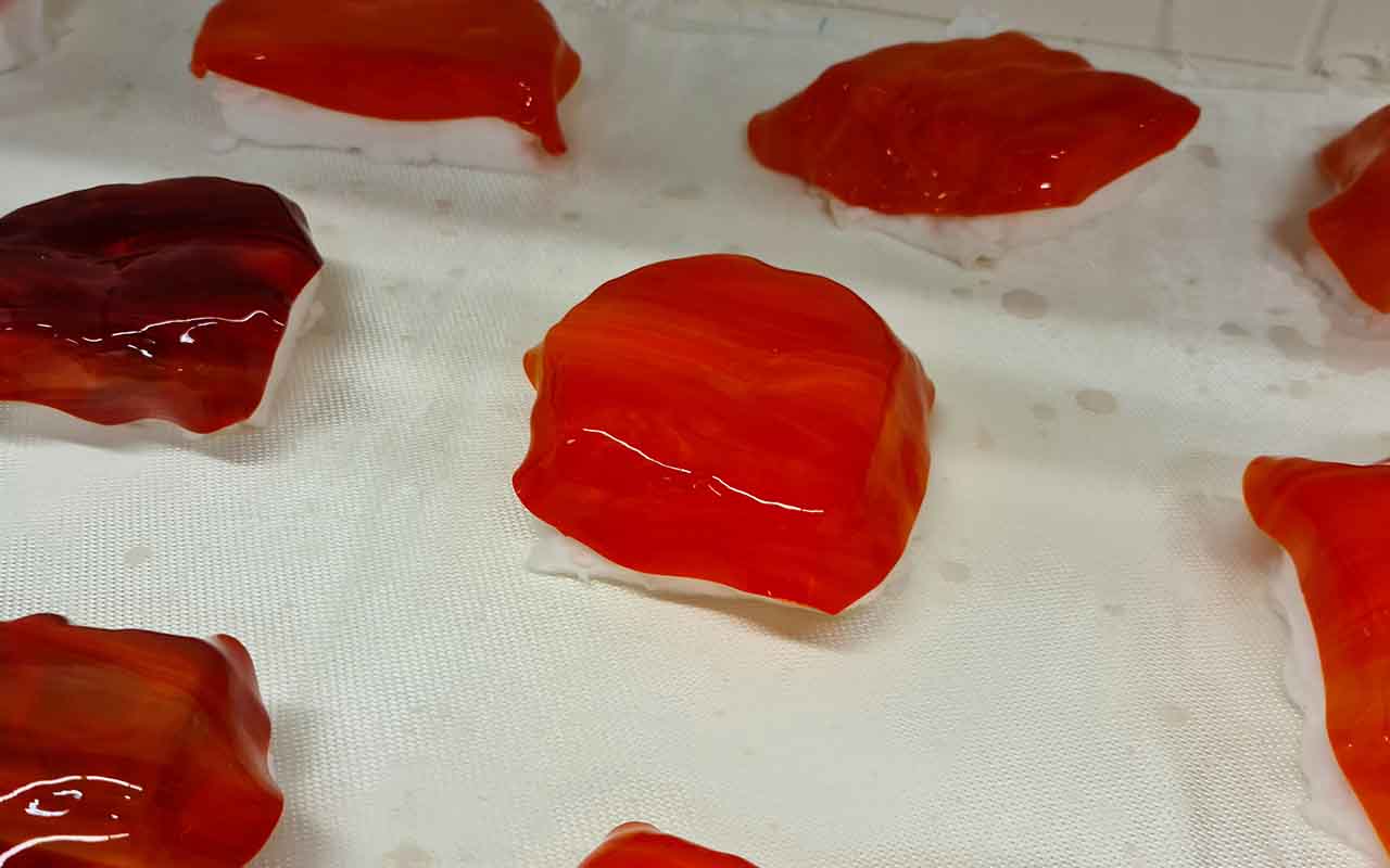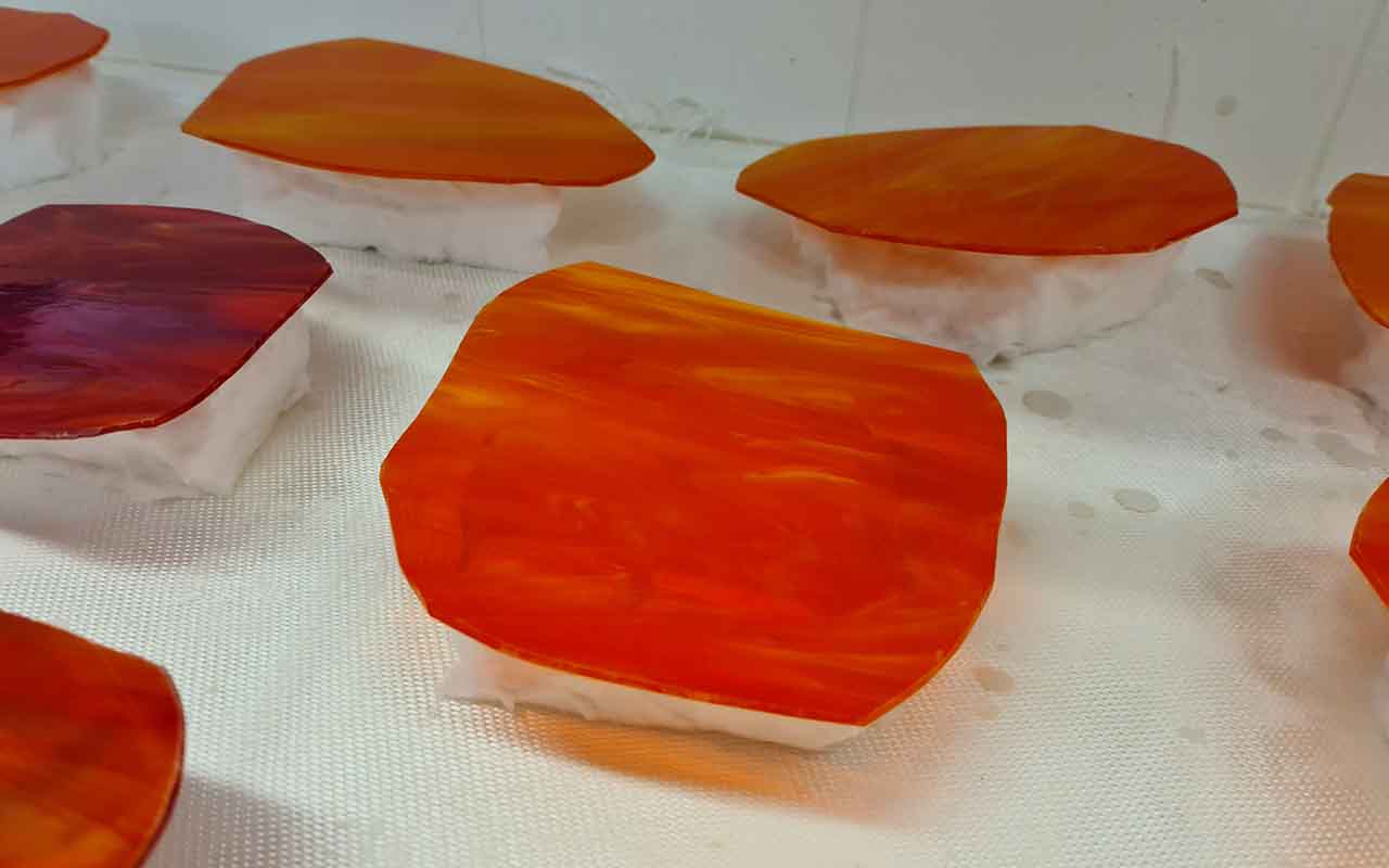 Wählen Sie ein paar aufeinander abgestimmte Glasstücke aus. Helle Farben halbtransparenter Gläser haben den intensivsten Effekt. Dunkle und transparente Gläser wirken etwas dezenter. Es muß kein Fusing-Glas sein. Auch andere Gläser lassen sich bei niedrigen Temperaturen verformen. Eventueller Nebeneffekt: eine seidenmatte Oberflächen-Struktur.