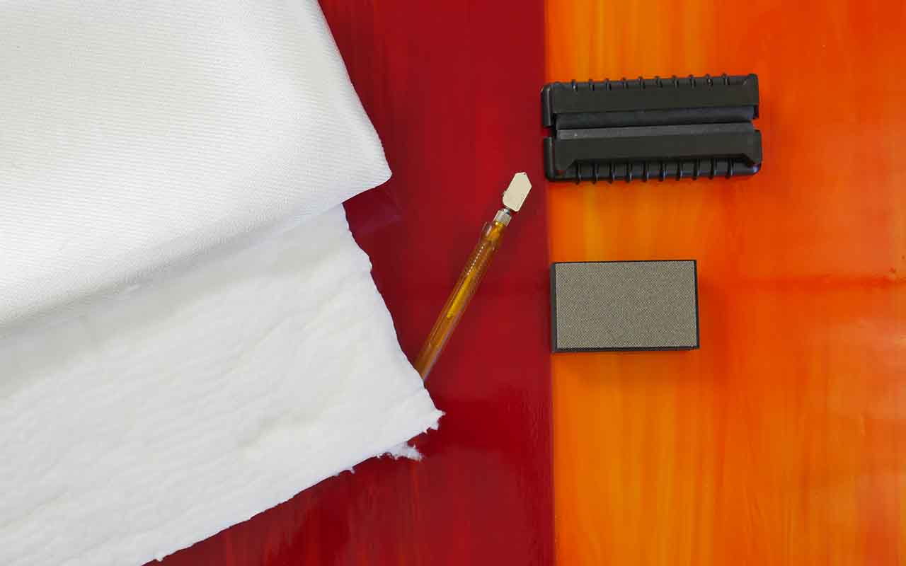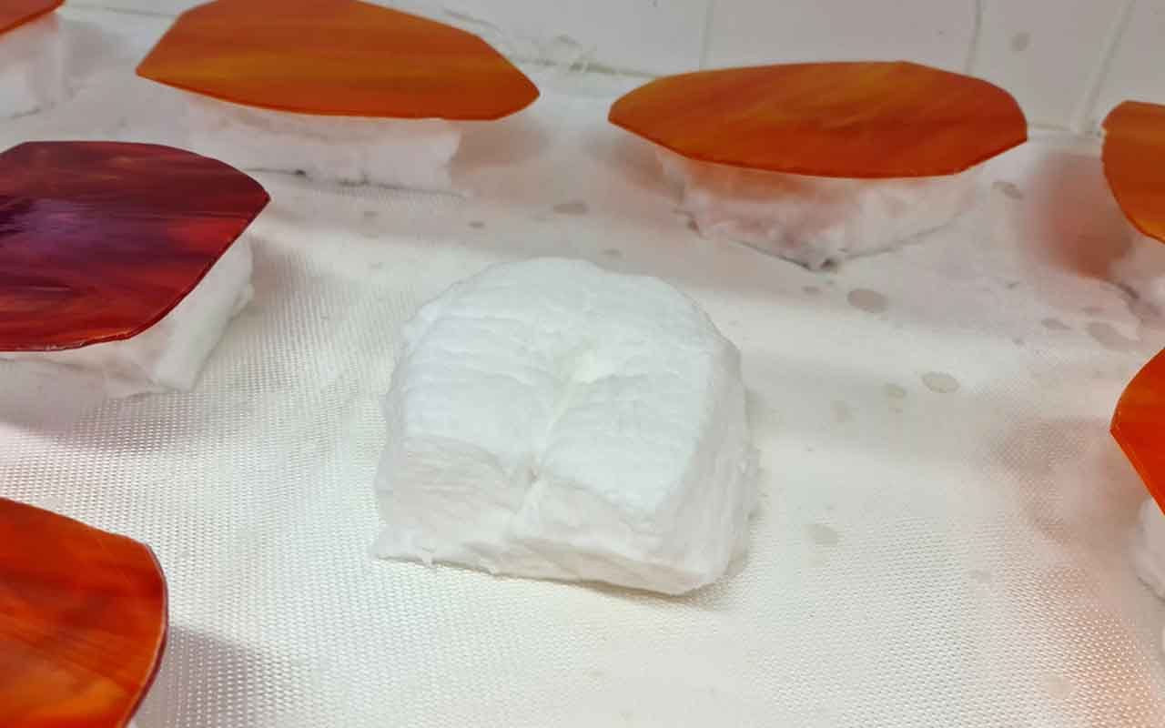 Schneiden bzw. reißen sie aus Cerablanket 3551227 (Faserwolle) „Stein ähnliche Stücke und formen diese. Schneiden Sie dementsprechend das Glas zu. Entgraten Sie die Kanten – ein einfacher Handentgrater 3050200 genügt – noch besser ein Schleifpad 3050401.