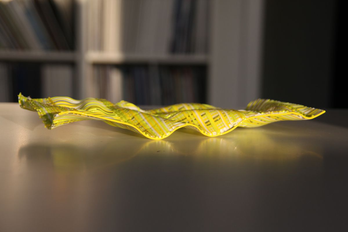 Im zweiten Schritt verformen Sie nun die flache Scheibe über einer freien Form aus Silikatexgewebe. Falten Sie das Gewebe bis eine interessante Form entsteht, die ihre vorgeschmolzene Glasscheibe später als fliegenden Teppich erscheinen lässt. Die Biegetemperatur in unserem Beispiel beträgt 660°C 30 min.