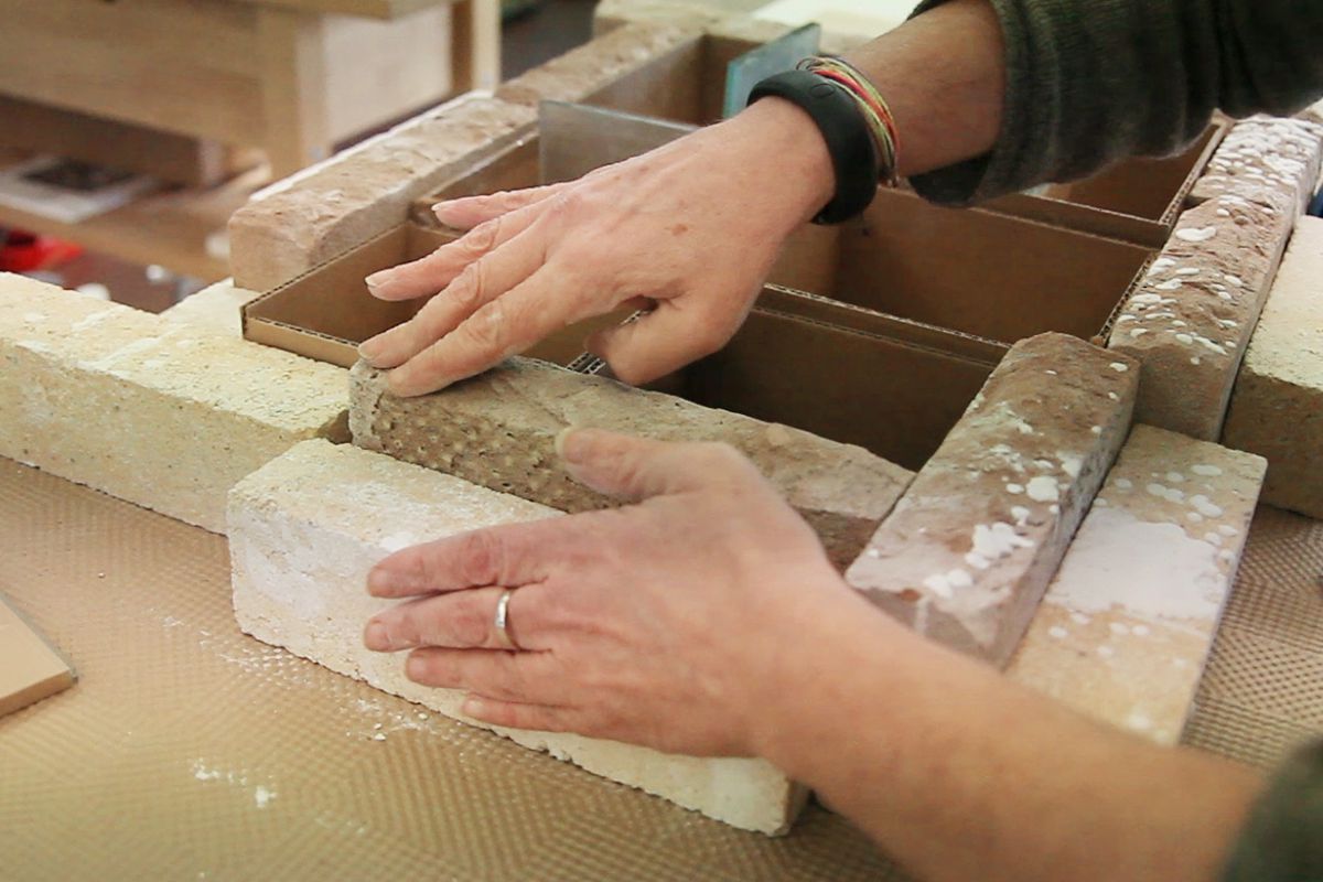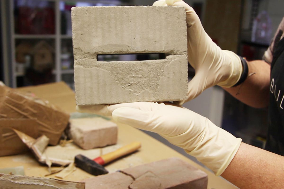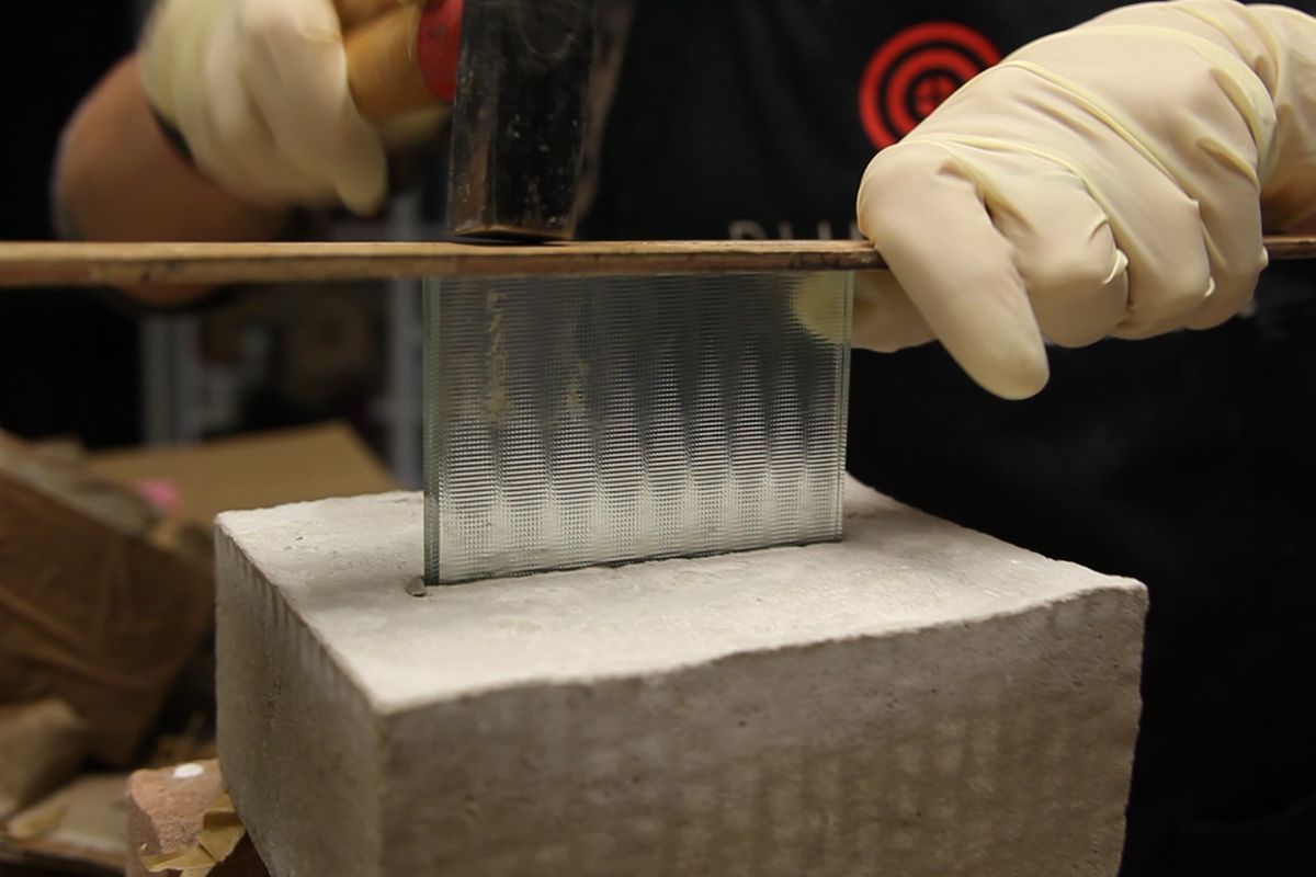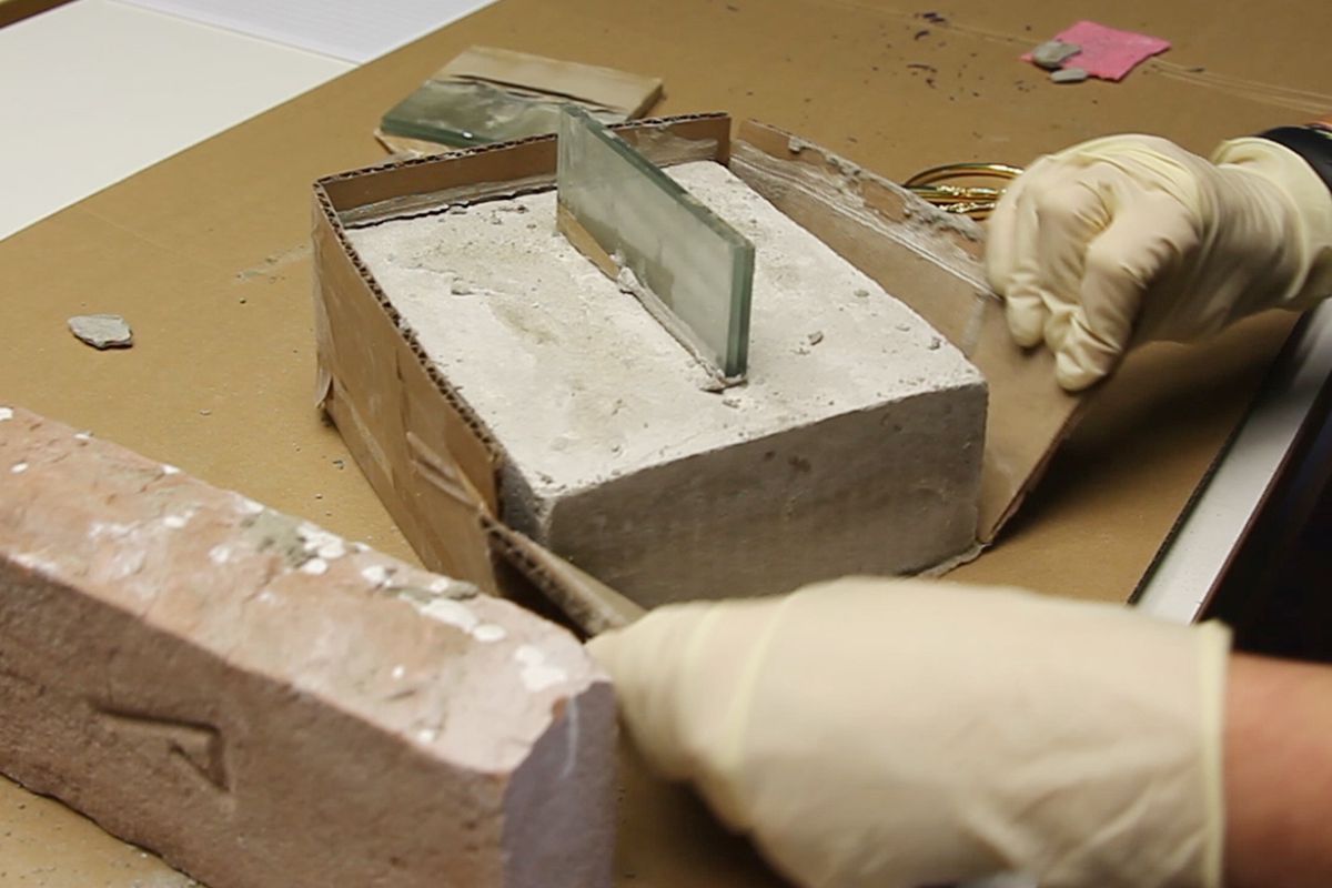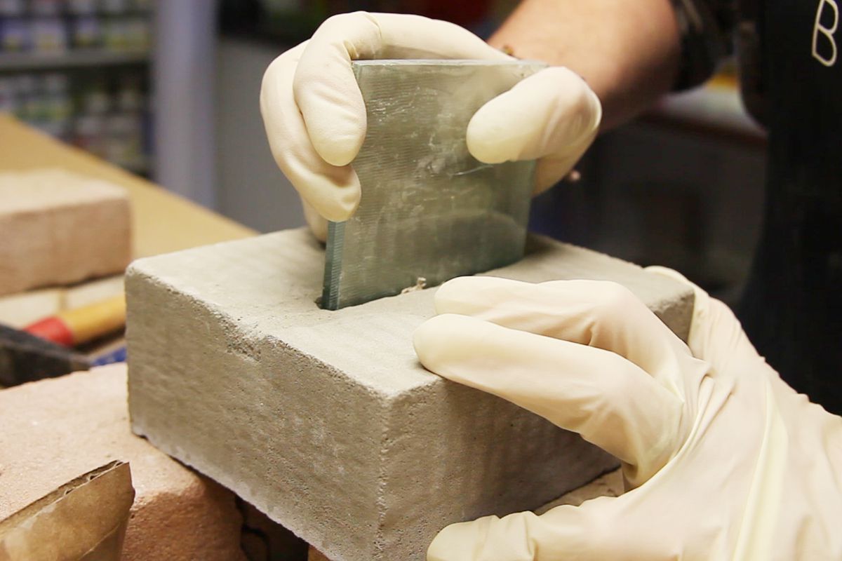 Then carefully push the glass in the block out of the cement. To do this, place a piece of wood on the glass edge and tap the edge with a hammer. Turn the block over and over again and hammer from the other side. This will release the adhesive tape from the cement and you can carefully pull out the glass. Do not try forcefully - the glass could shatter or the cement block could break.