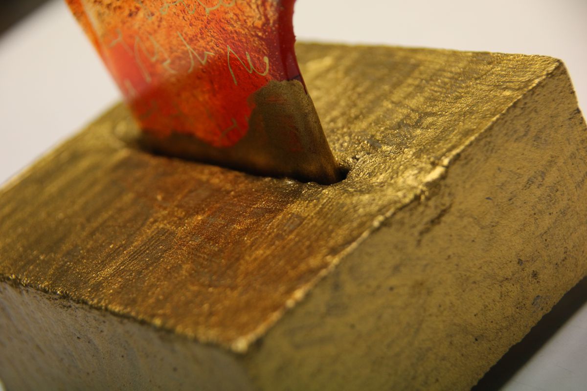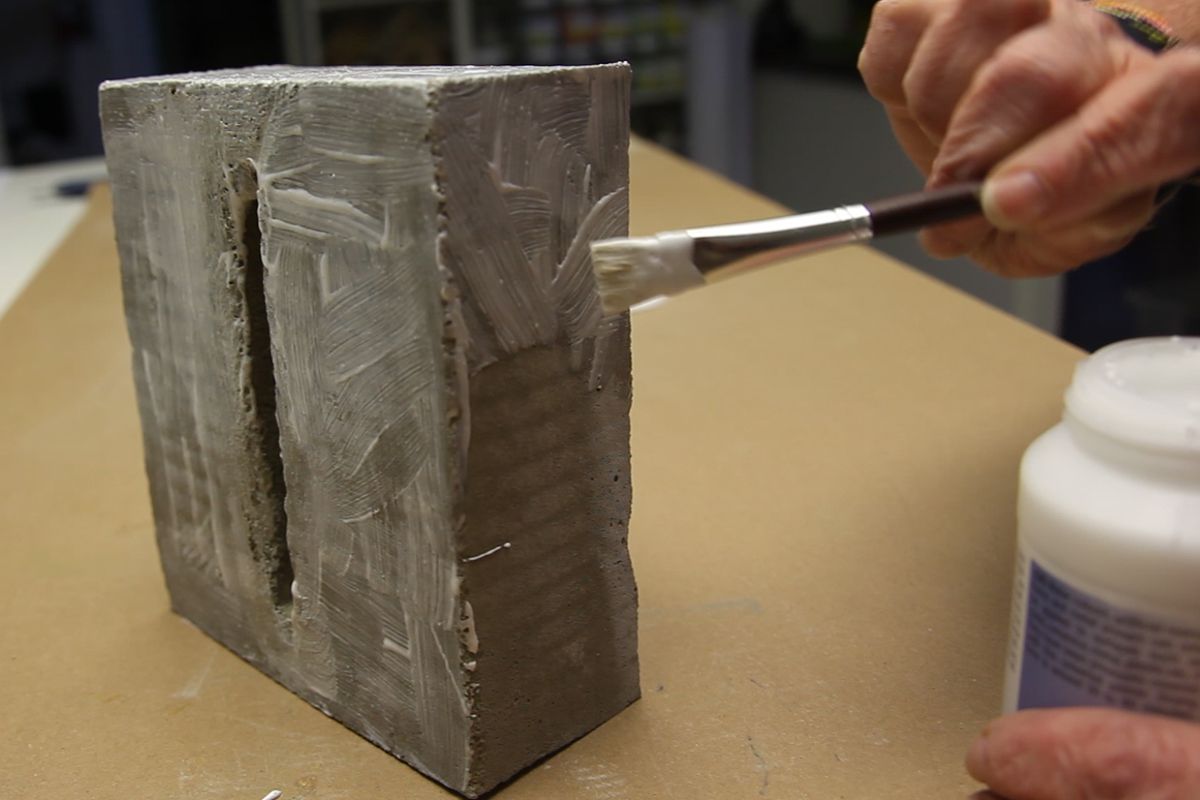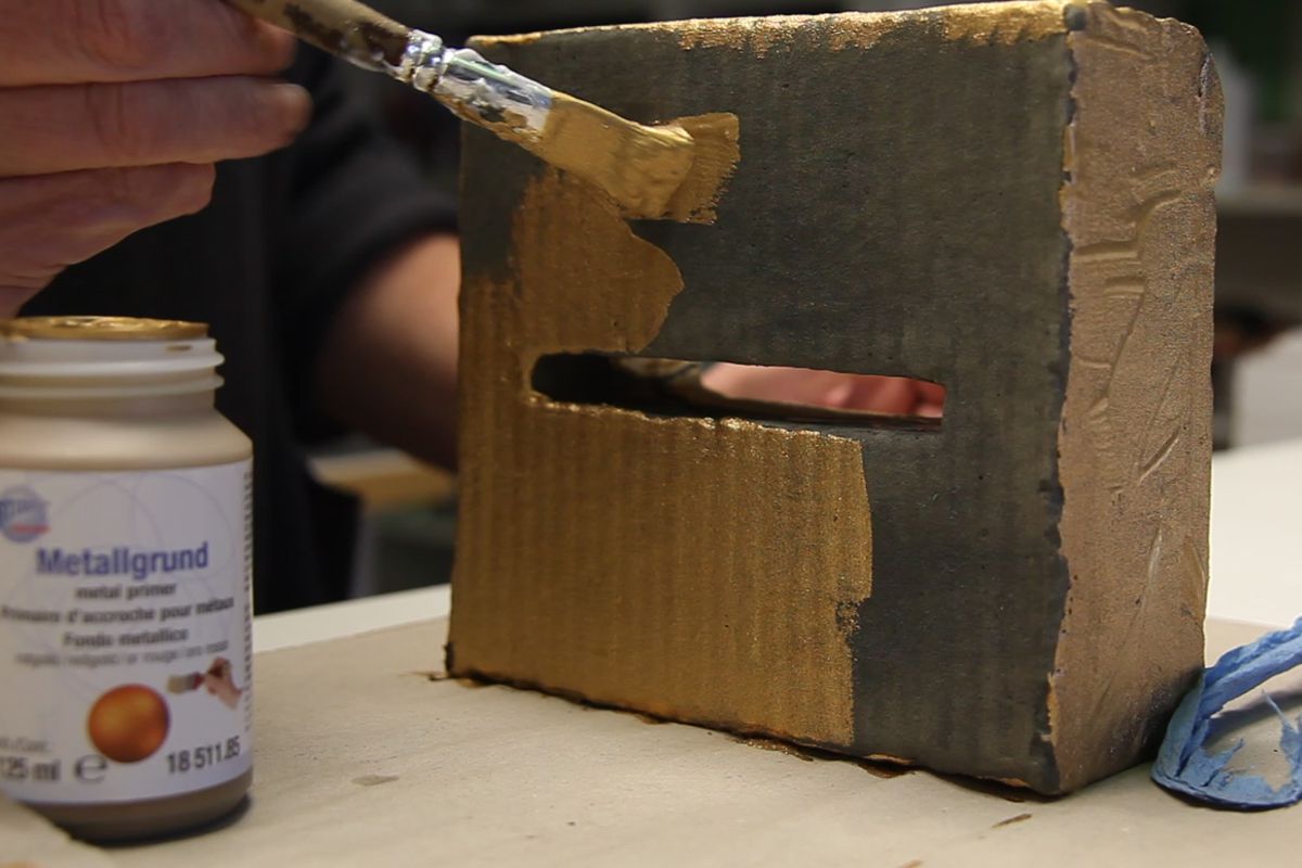 Brush the cement with the primer and let it dry well. In the next step, apply the iron base or a metal base gold - silver. These metallic substrates will later be used as the basis for the oxidation effects.