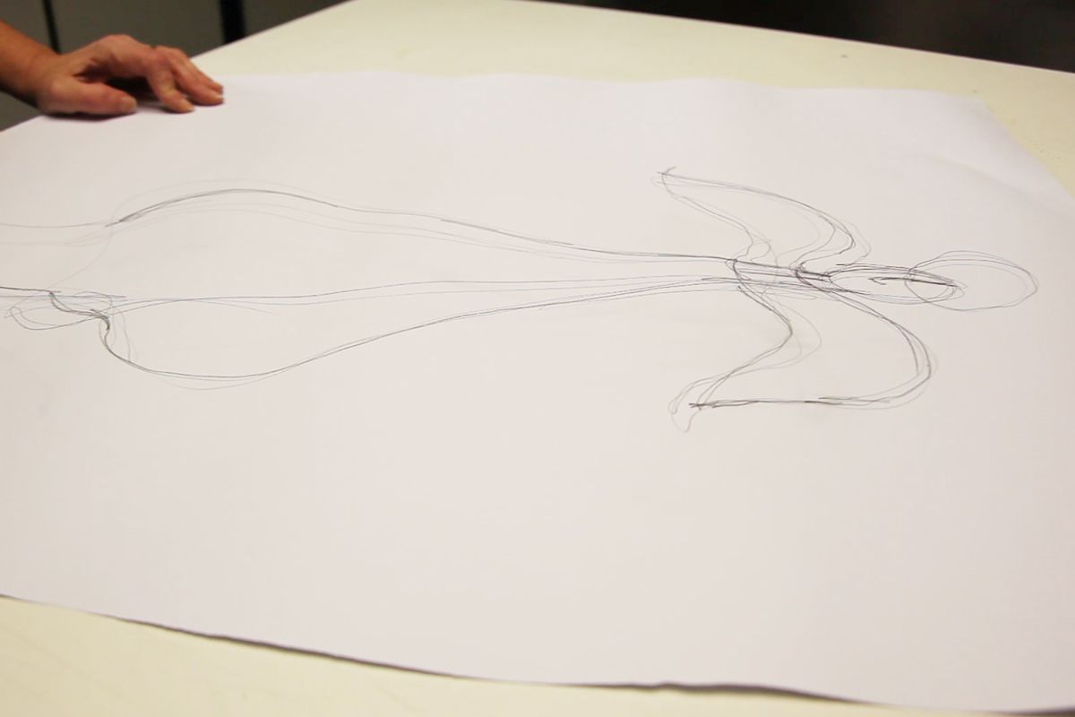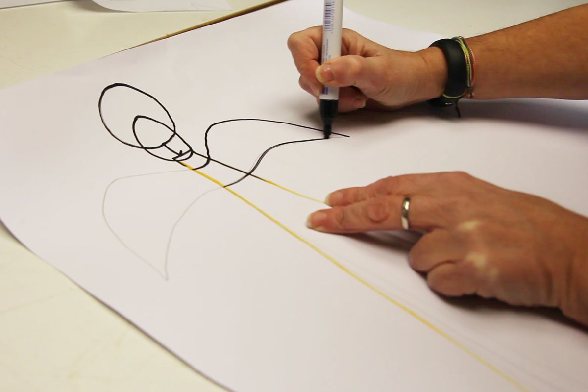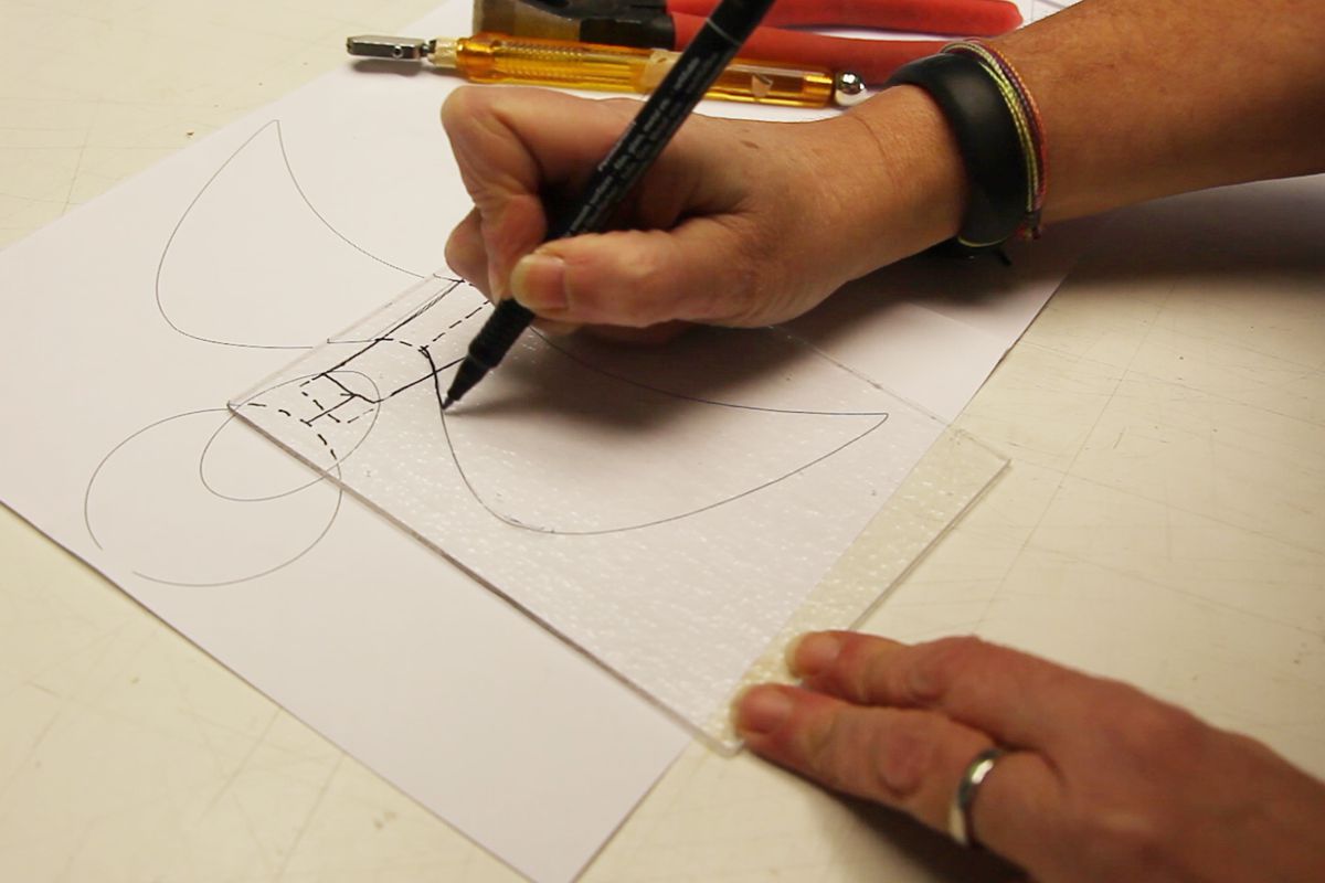 Sketch your desired body shape in pencil on a piece of paper. Draw the desired line with a felt pen and mark the later position of the wings. Transfer the shape of the head, like that of the wings and body, to the glass used.