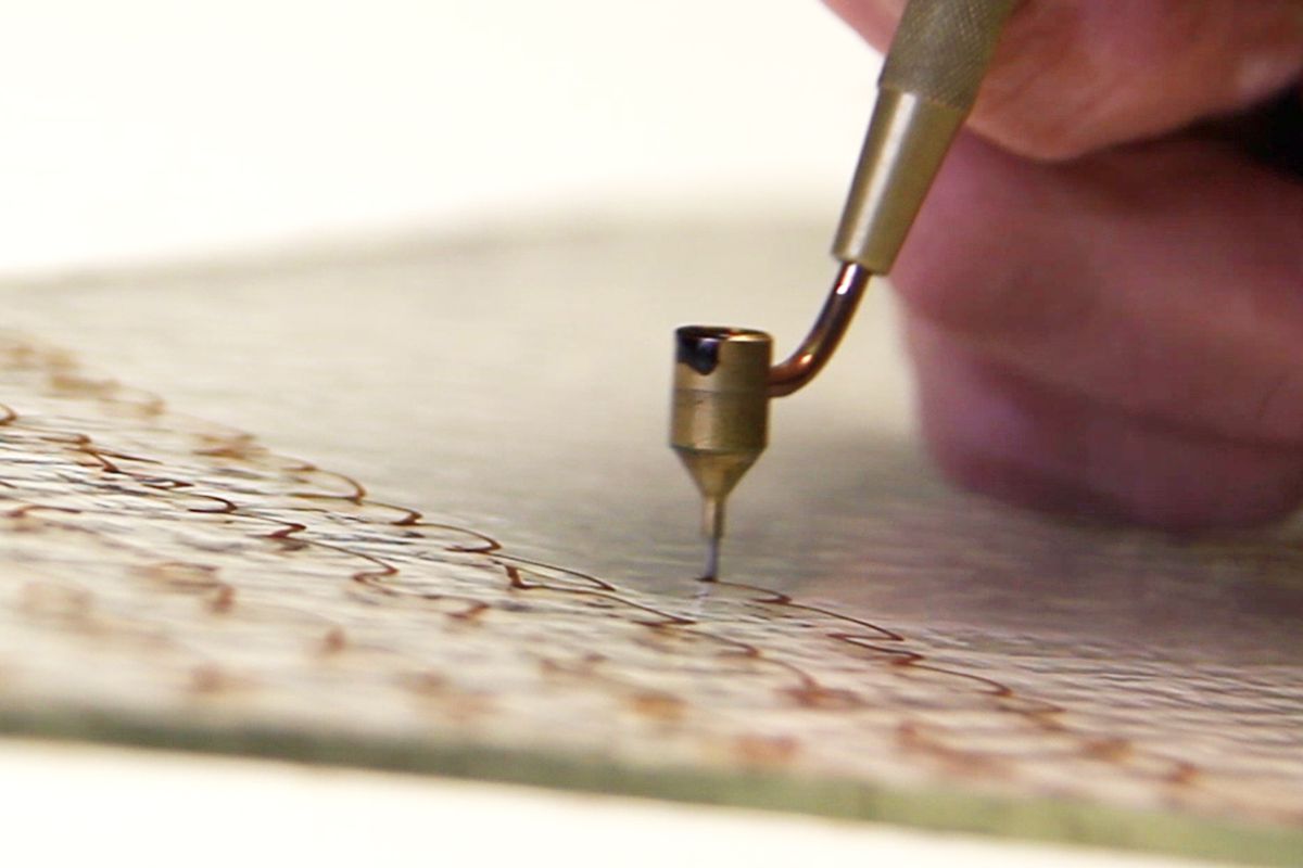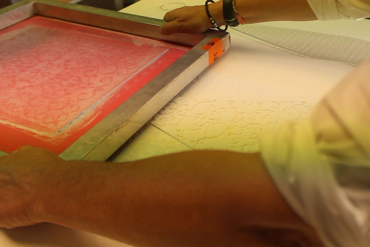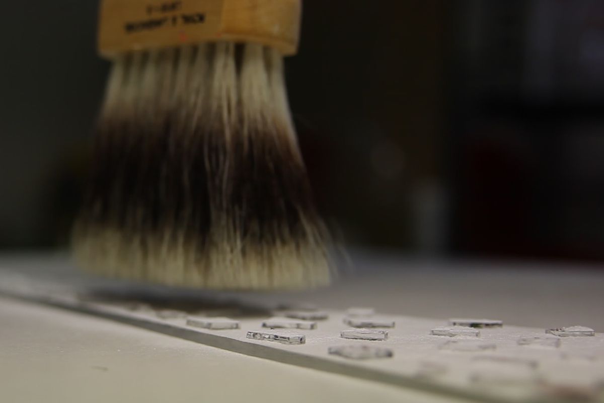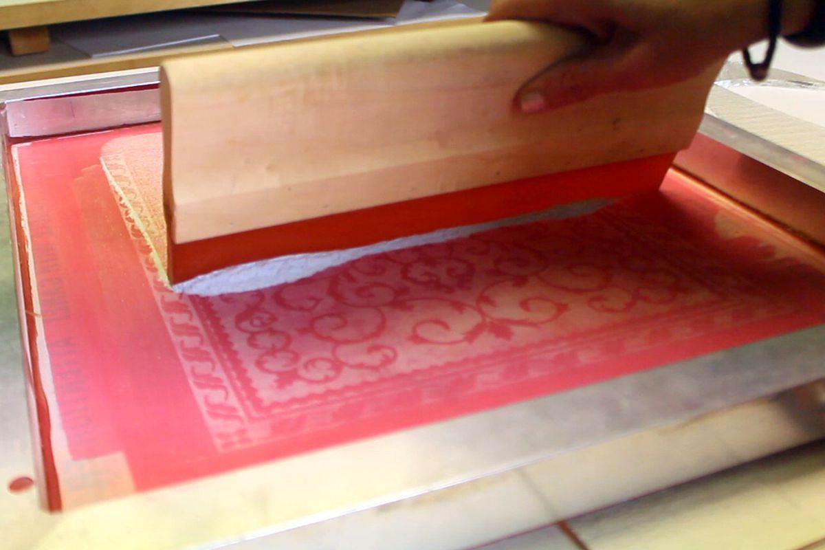 For this we use the technology that is also used in the print sector. However, we use glass powder instead of the printing ink. Place the sieve on the glass with a little space, put the powder on the upper part of the sieve and draw it evenly with the squeegee over the sieve. When removing the sieve, be careful not to blur the pattern.
