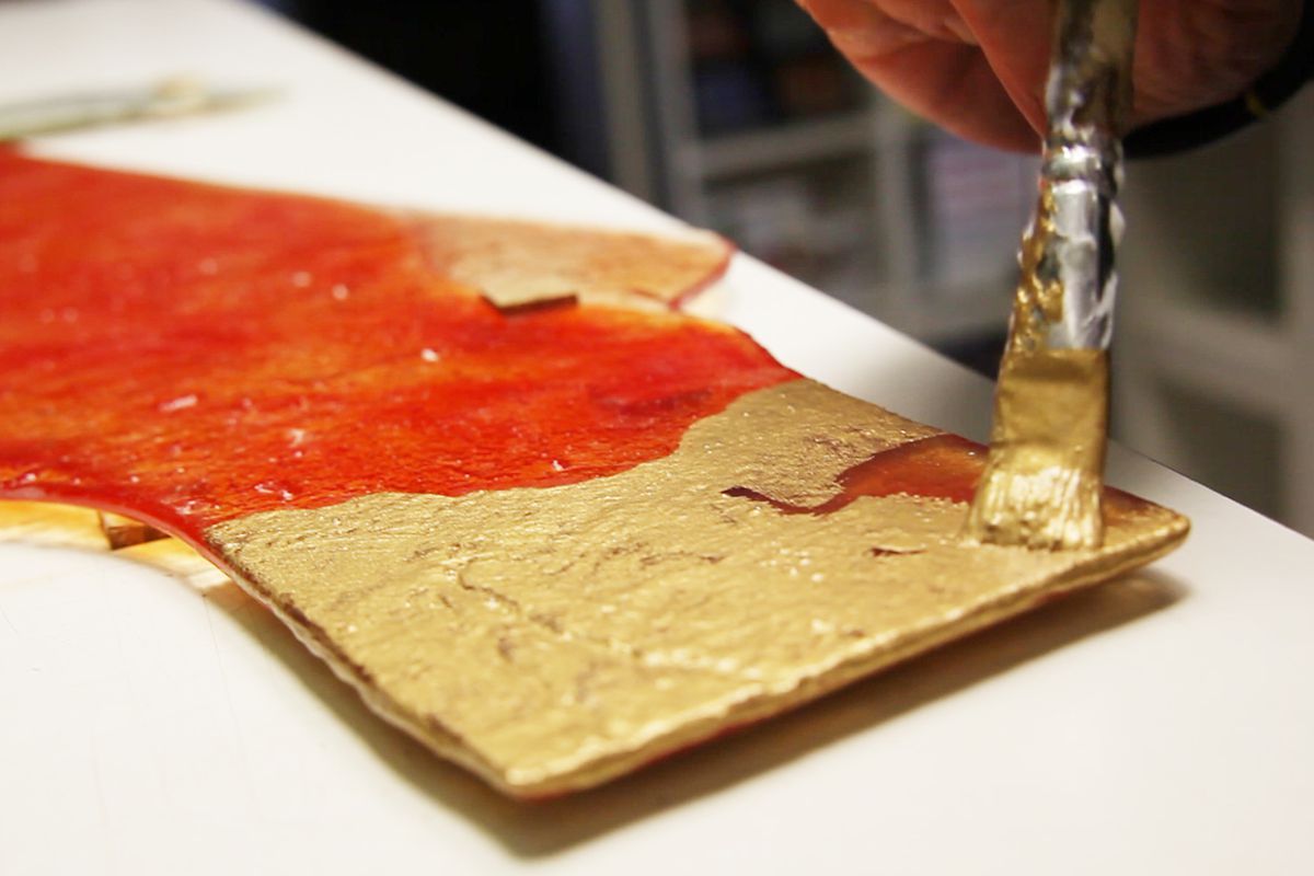 Would you like a little more color? Then powder the colorless, lower glass base with colored glass powder. Place the upper layer on top. This can then be decorated with liquid gold, for example, and the pen for lettering.