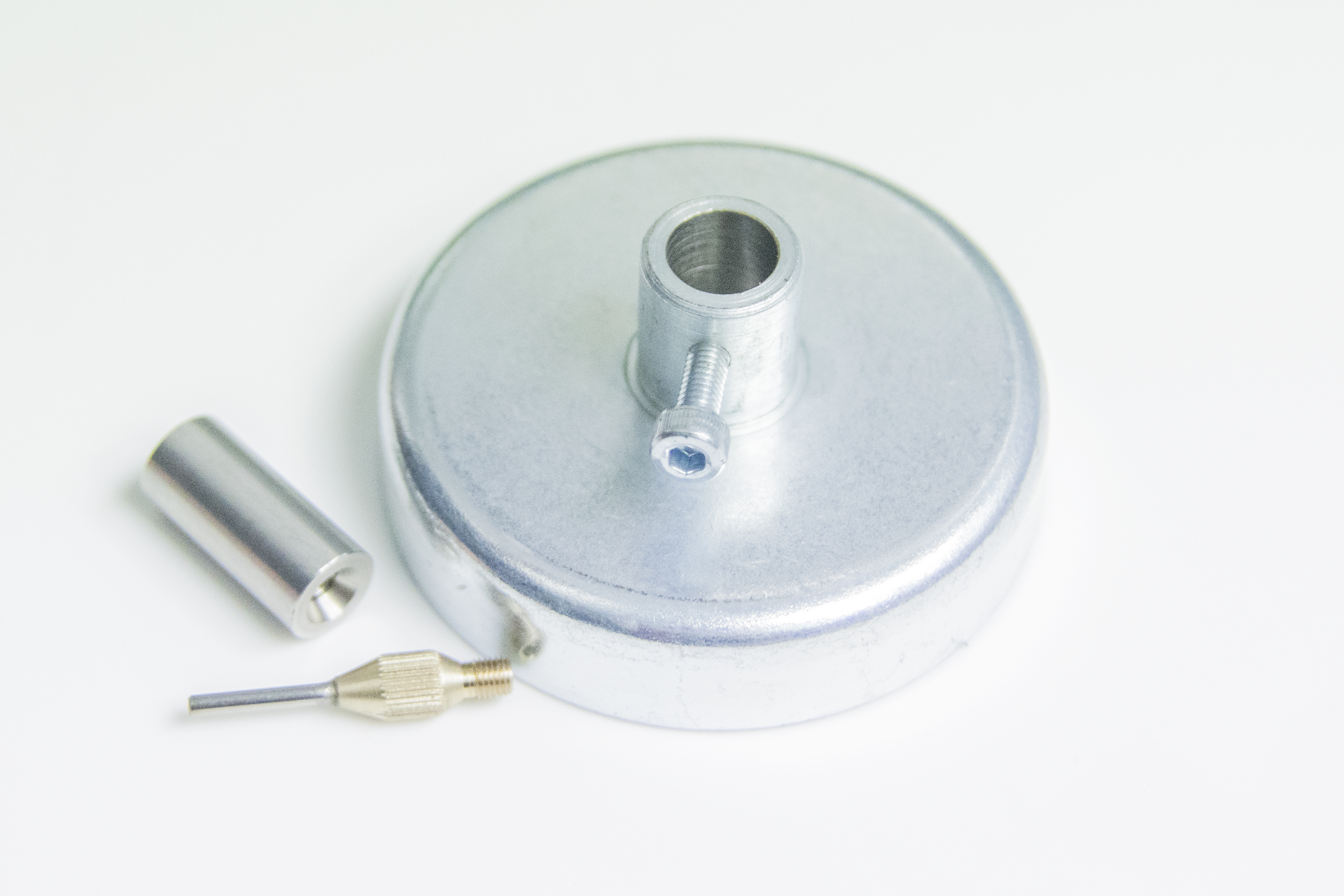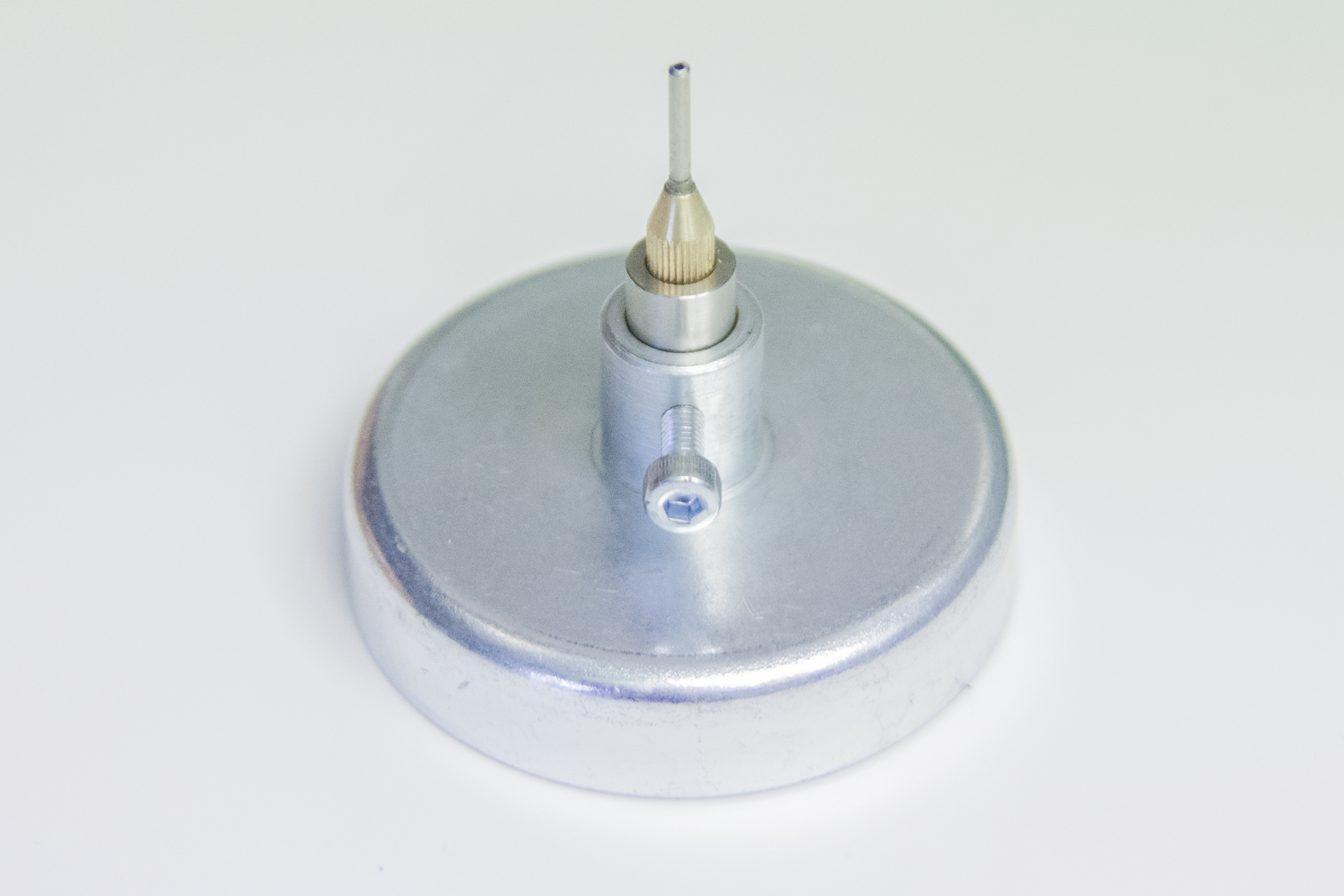 Magnetic base, metal plate, metal insert & counterpart: To prevent the drill core from breaking, the glass piece should always be drilled from 2 sides become. Place the magnetic base on the drill table. Then the metal insert is put into the magnetic base. If you want to drill a 2mm hole, take the matching counterpart, which is slightly thinner than the drill, about 2-3 tenths and turn this into the metal insert.