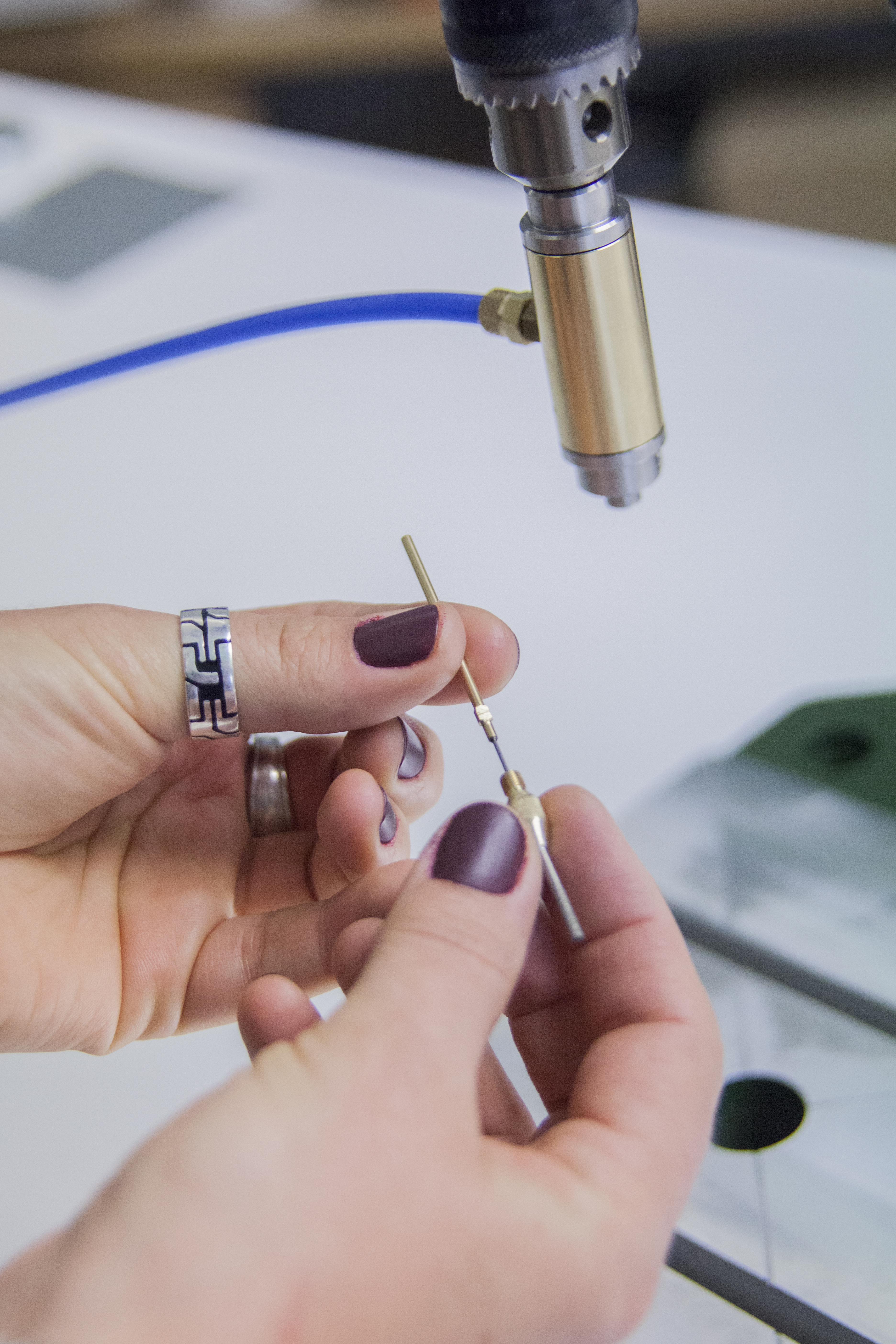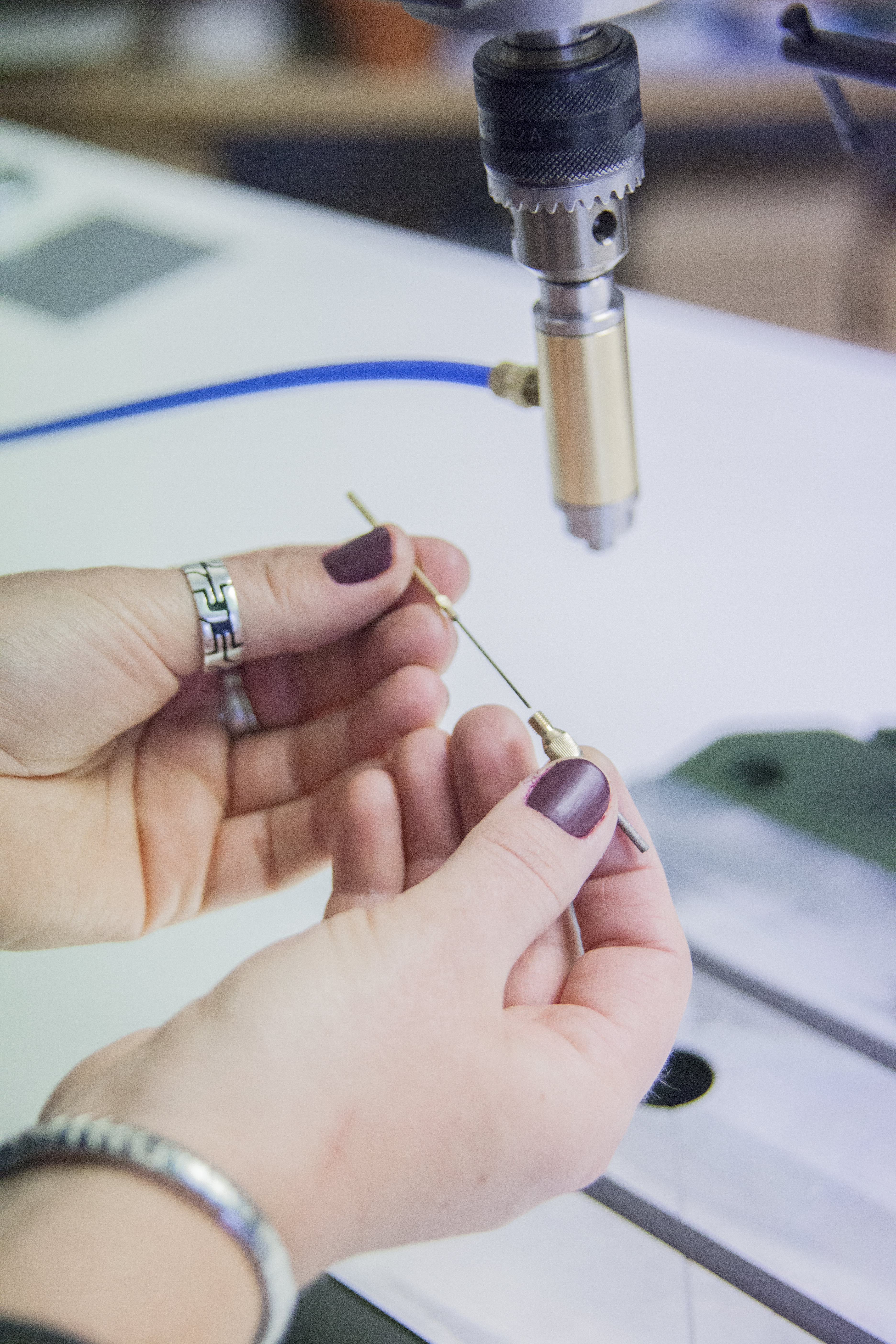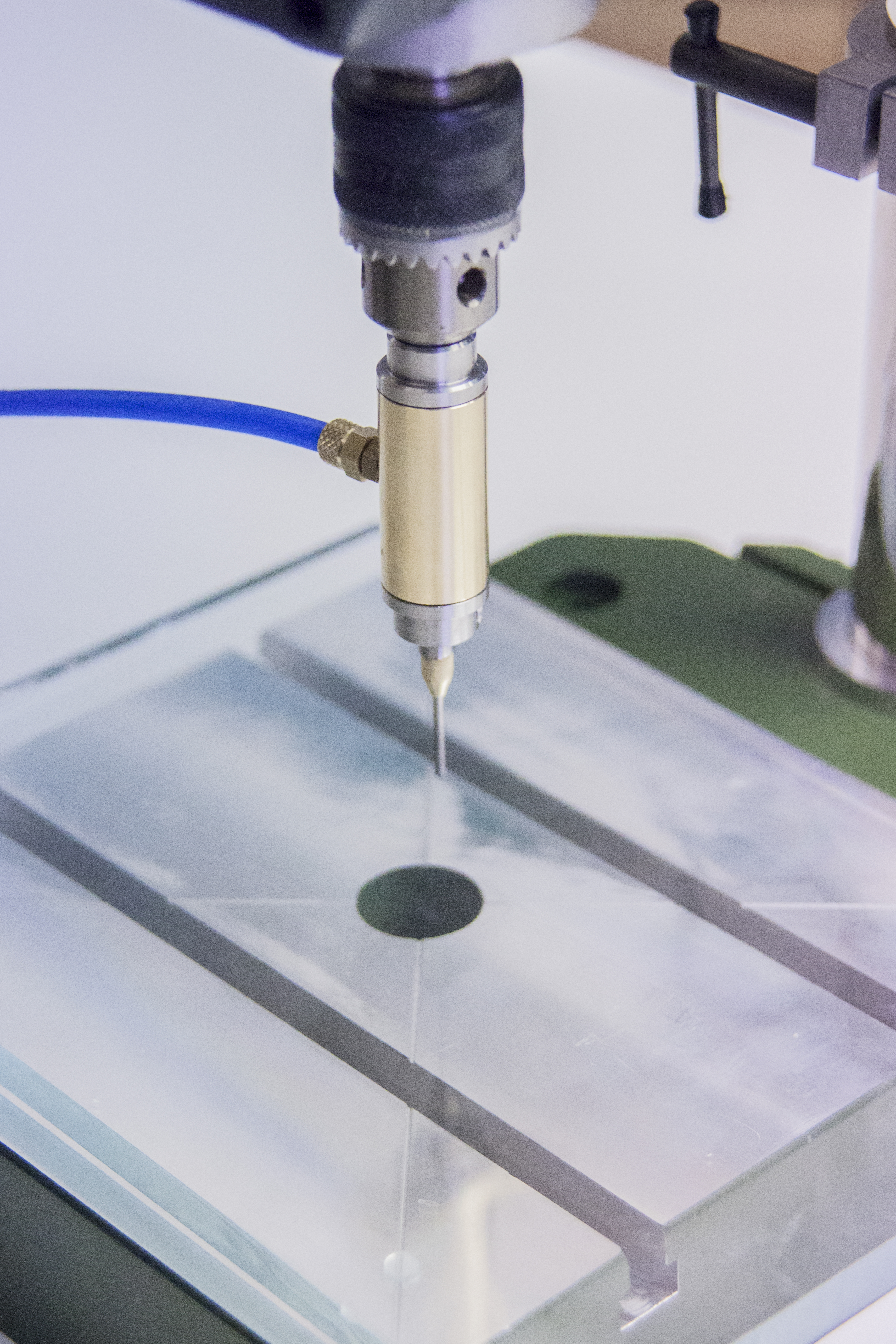 The counterpart should be as long as possible so that the glass does not rest on the brass part (threaded piece). Otherwise it may happen that the glass breaks off at the drill entrance. Should it be difficult to drill the glass piece because of the protruding ejection needle, you can first drill the glass without ejection needle from both sides and reuse the ejector needle to pierce.