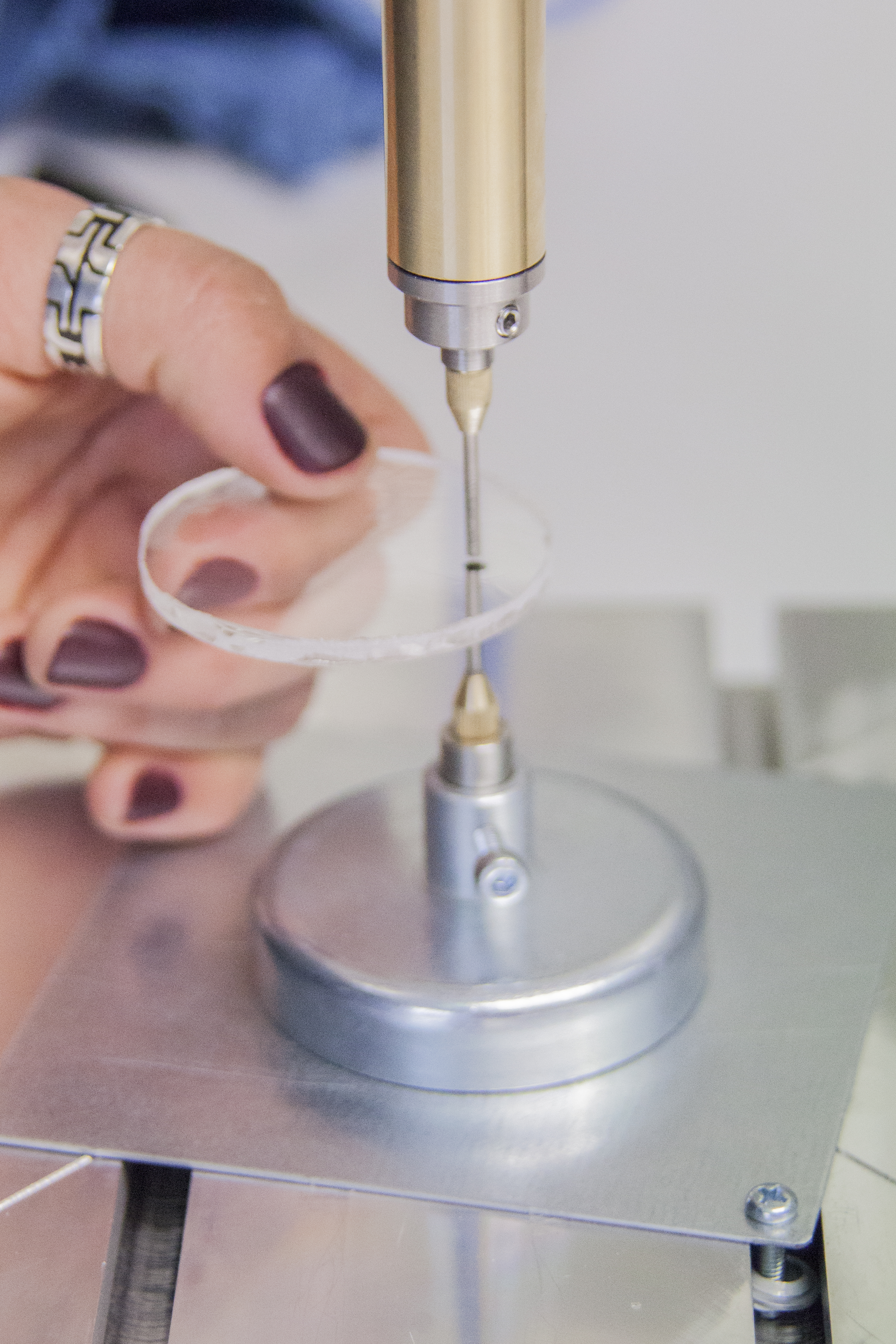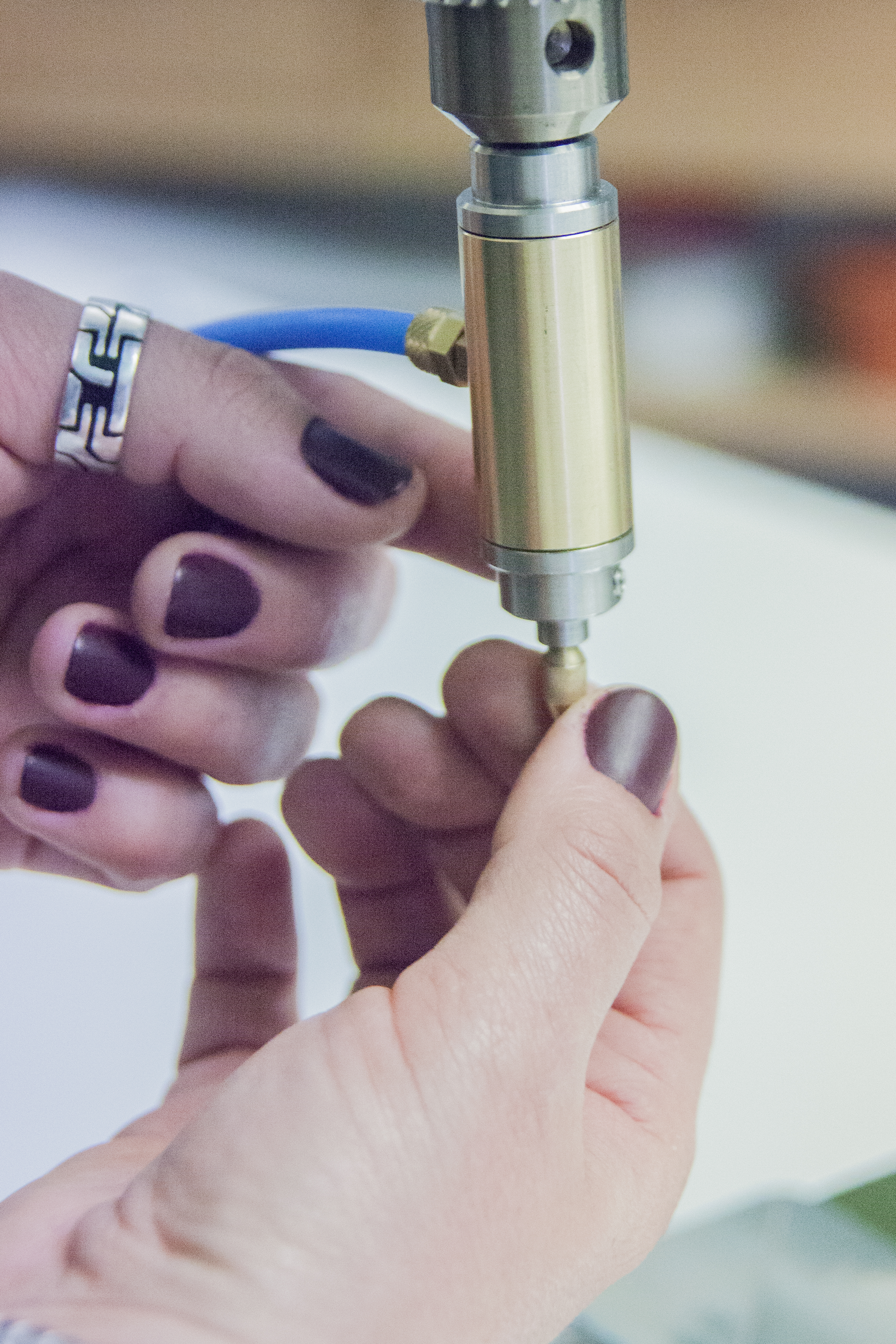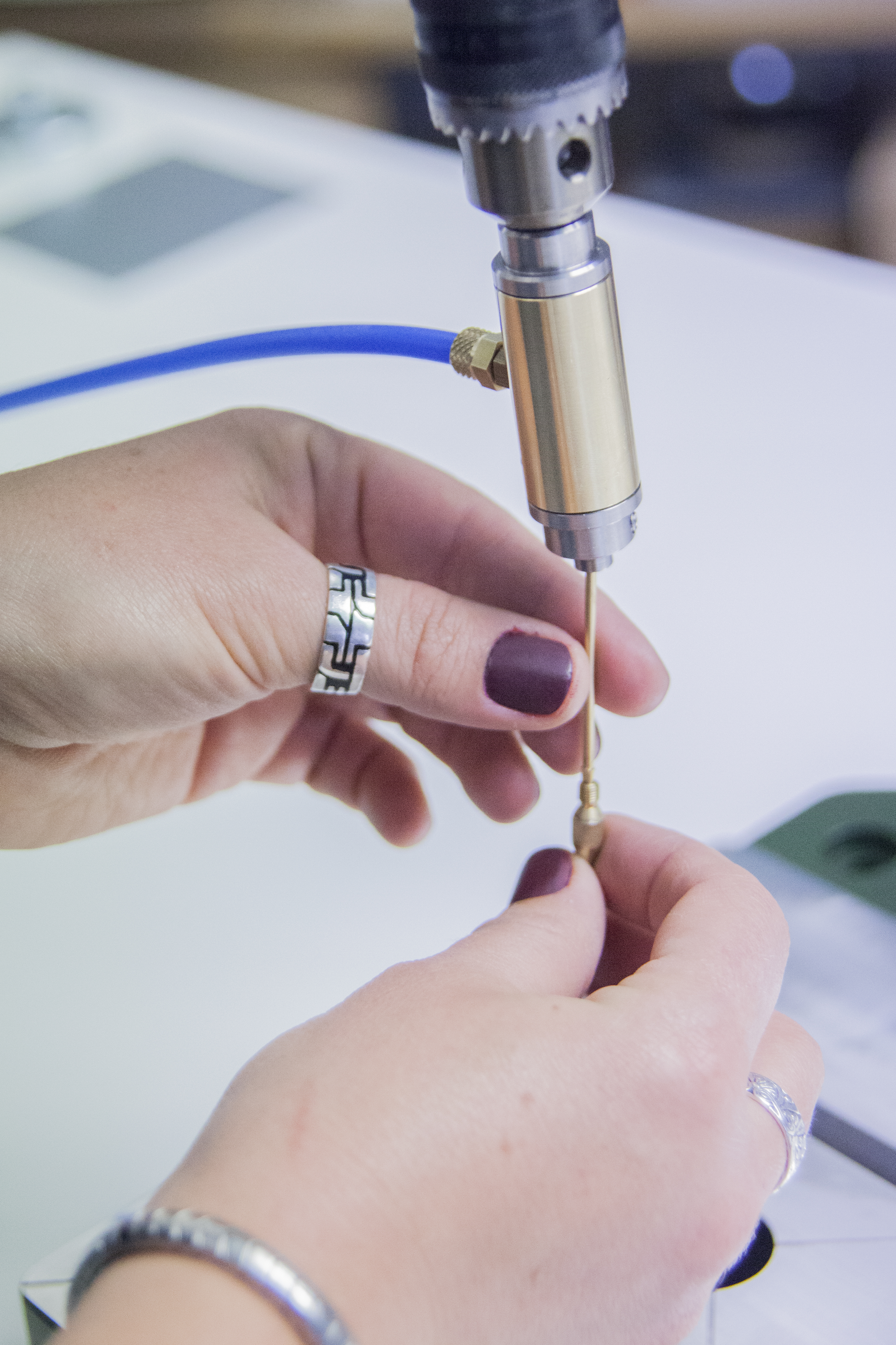 The counterpart should be as long as possible so that the glass does not rest on the brass part (threaded piece). Otherwise it may happen that the glass breaks off at the drill entrance. Should it be difficult to drill the glass piece because of the protruding ejection needle, you can first drill the glass without ejection needle from both sides and reuse the ejector needle to pierce.