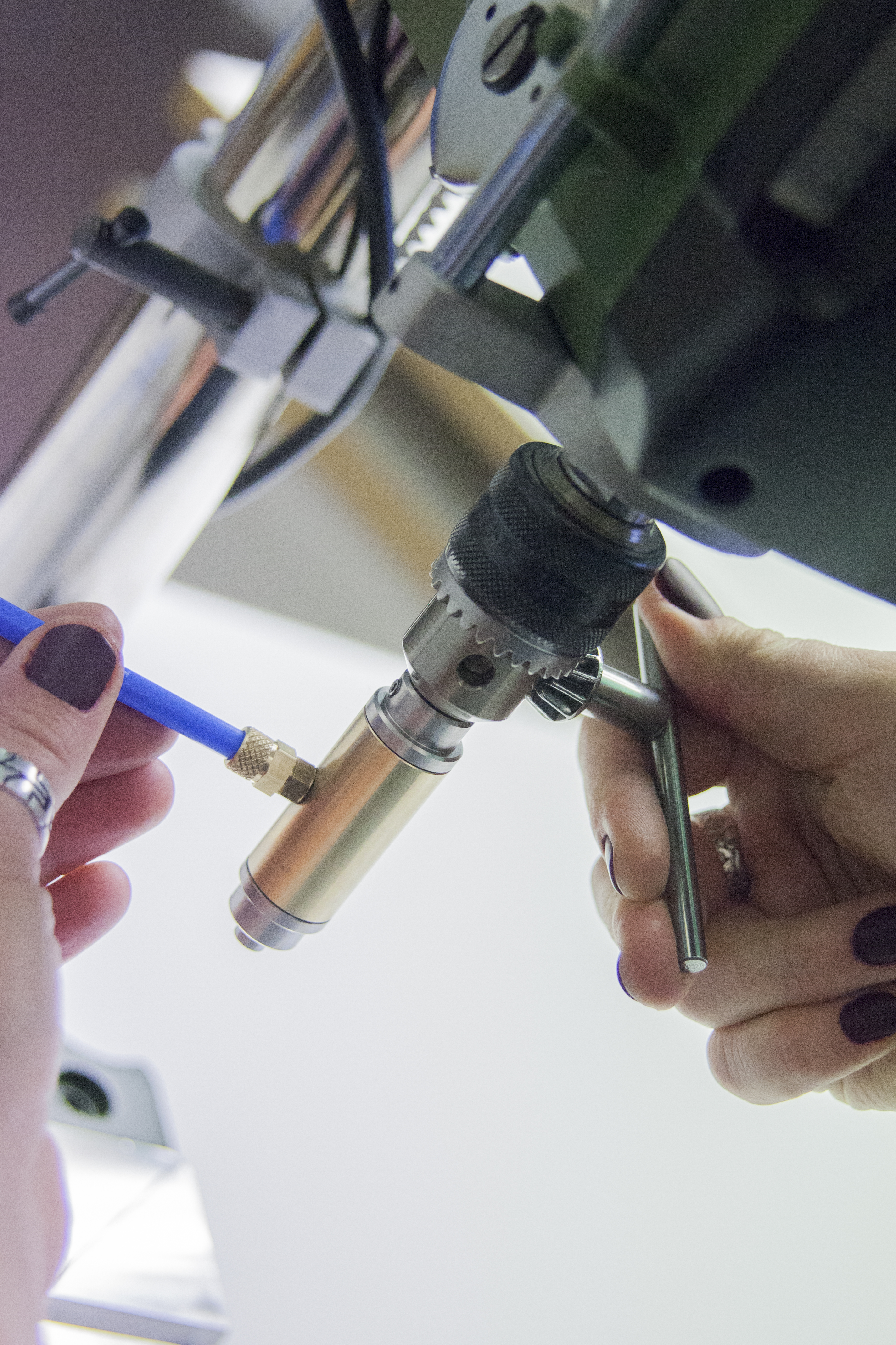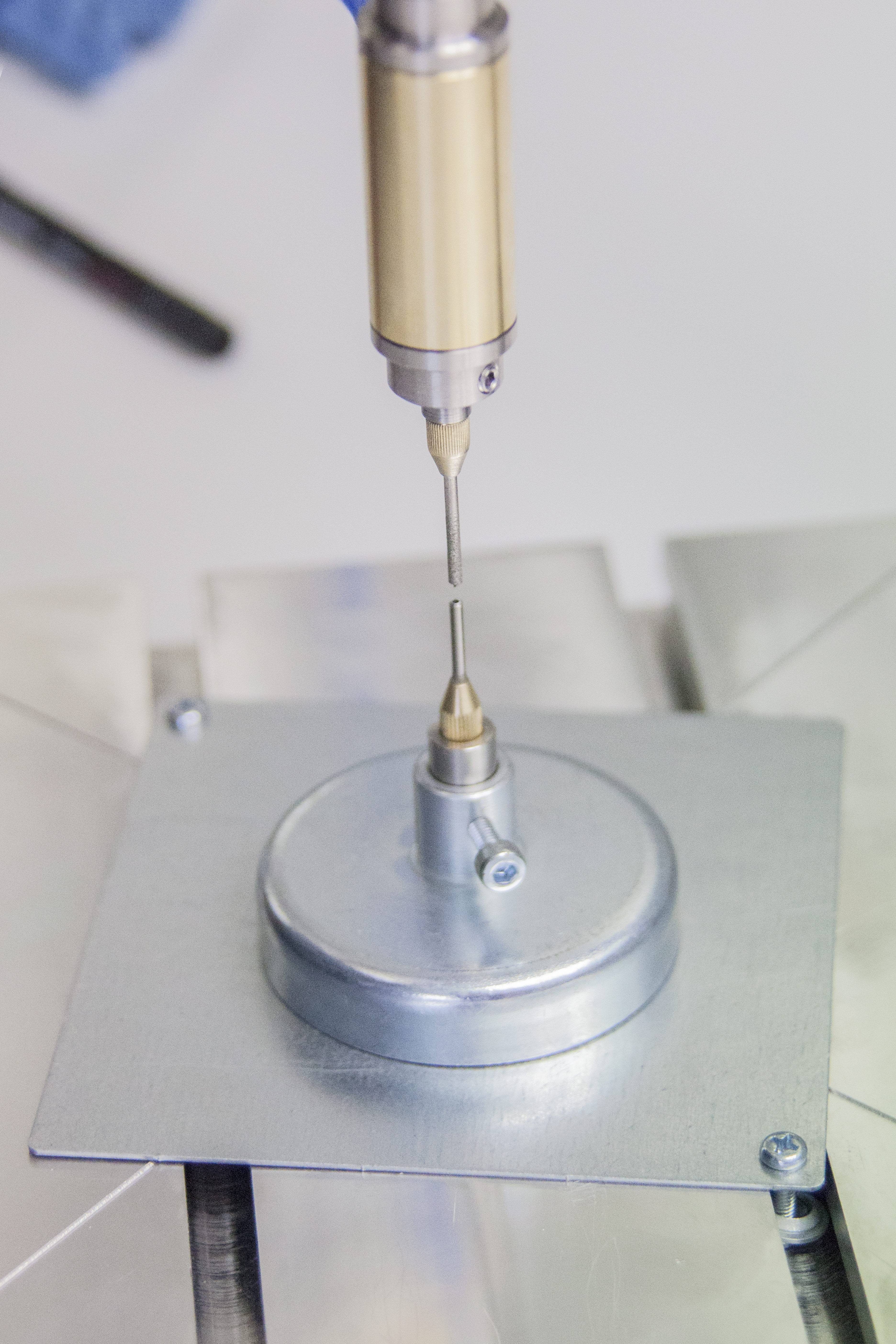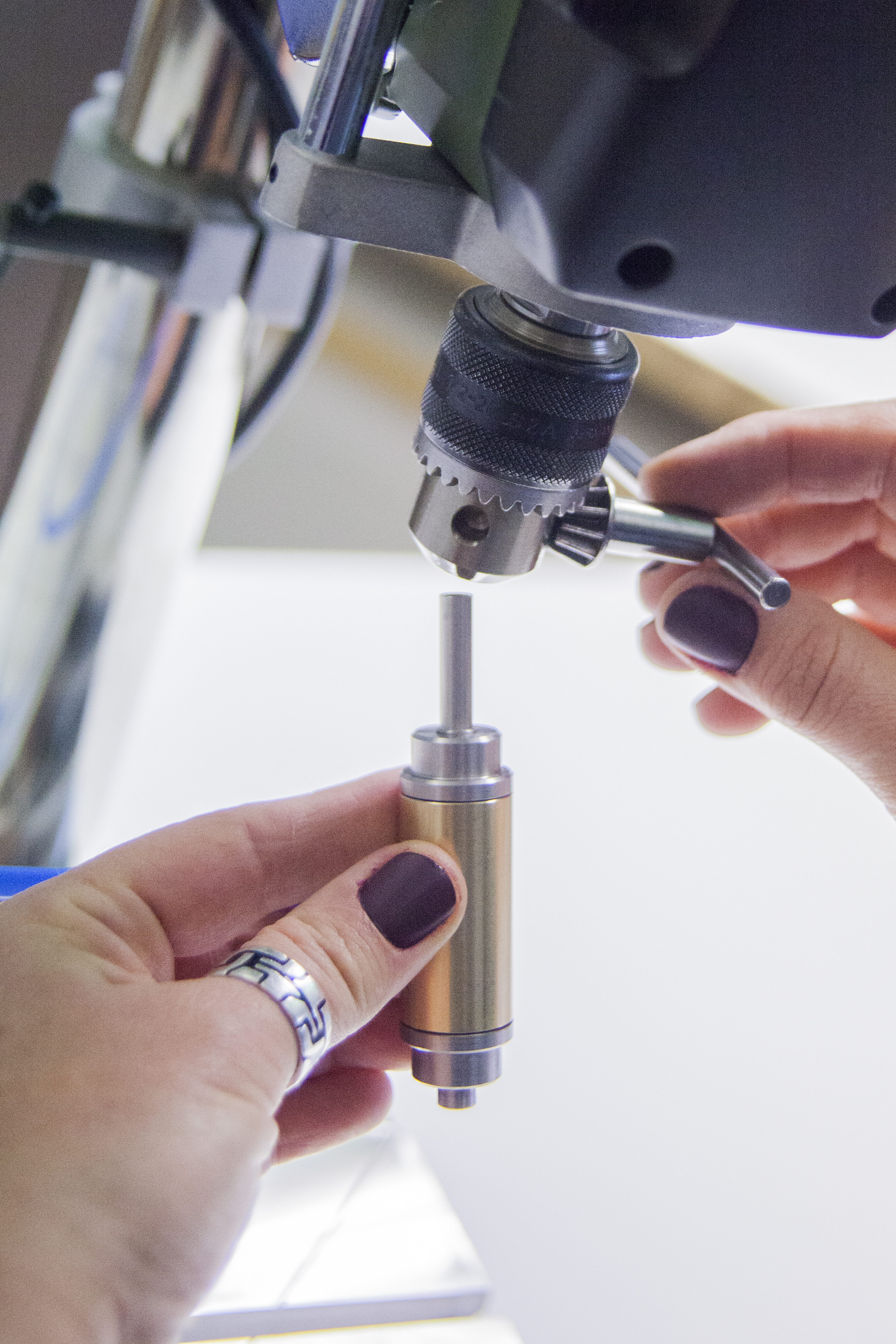 Now you can take a desired diamond drill. In this there is an ejection needle. Insert the drill with this ejector needle into the spindle. Press lightly upwards and let the thread „bite“. Tighten the drill bit to the end and, if necessary, carefully tighten the drill bit with pliers to the spindle.