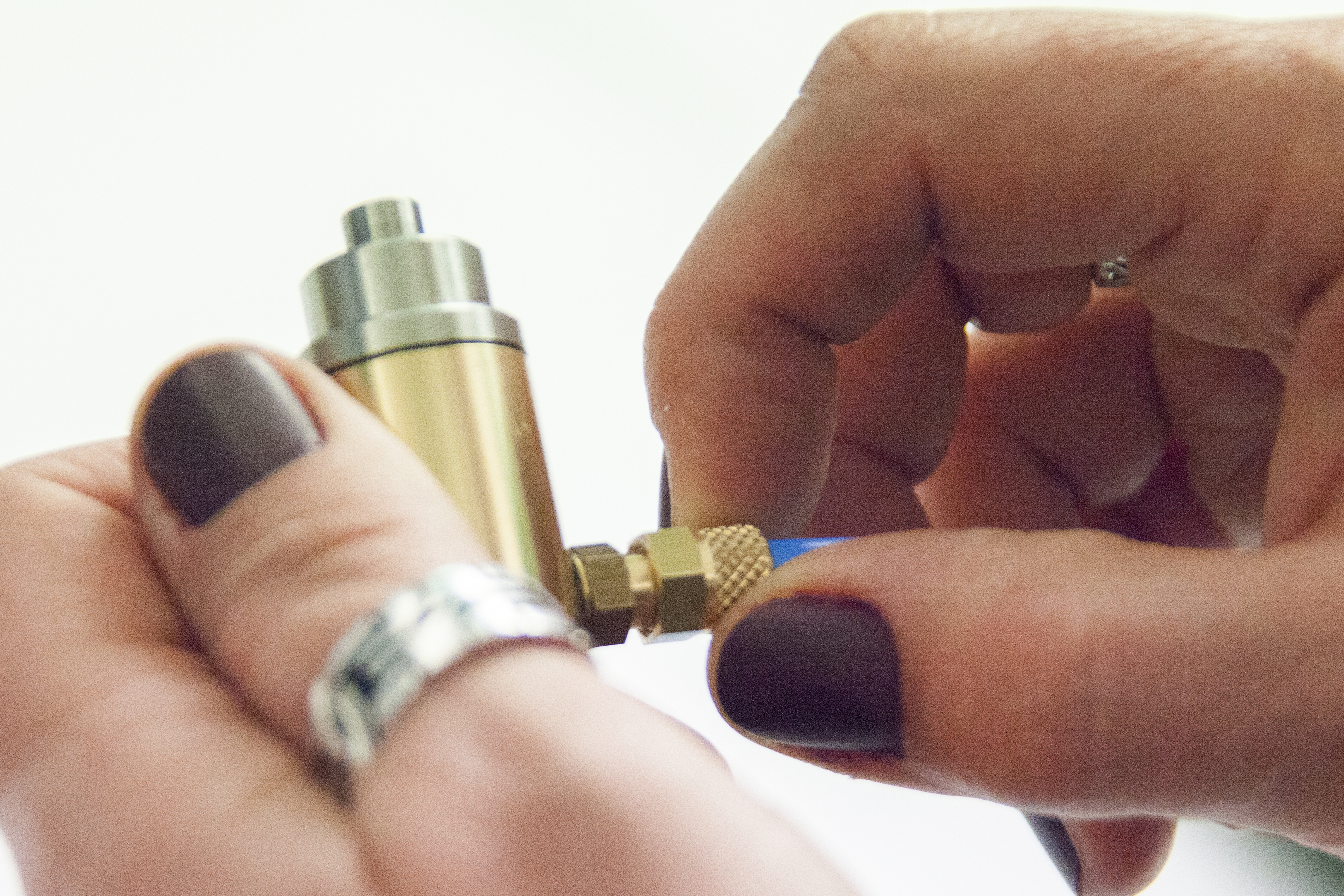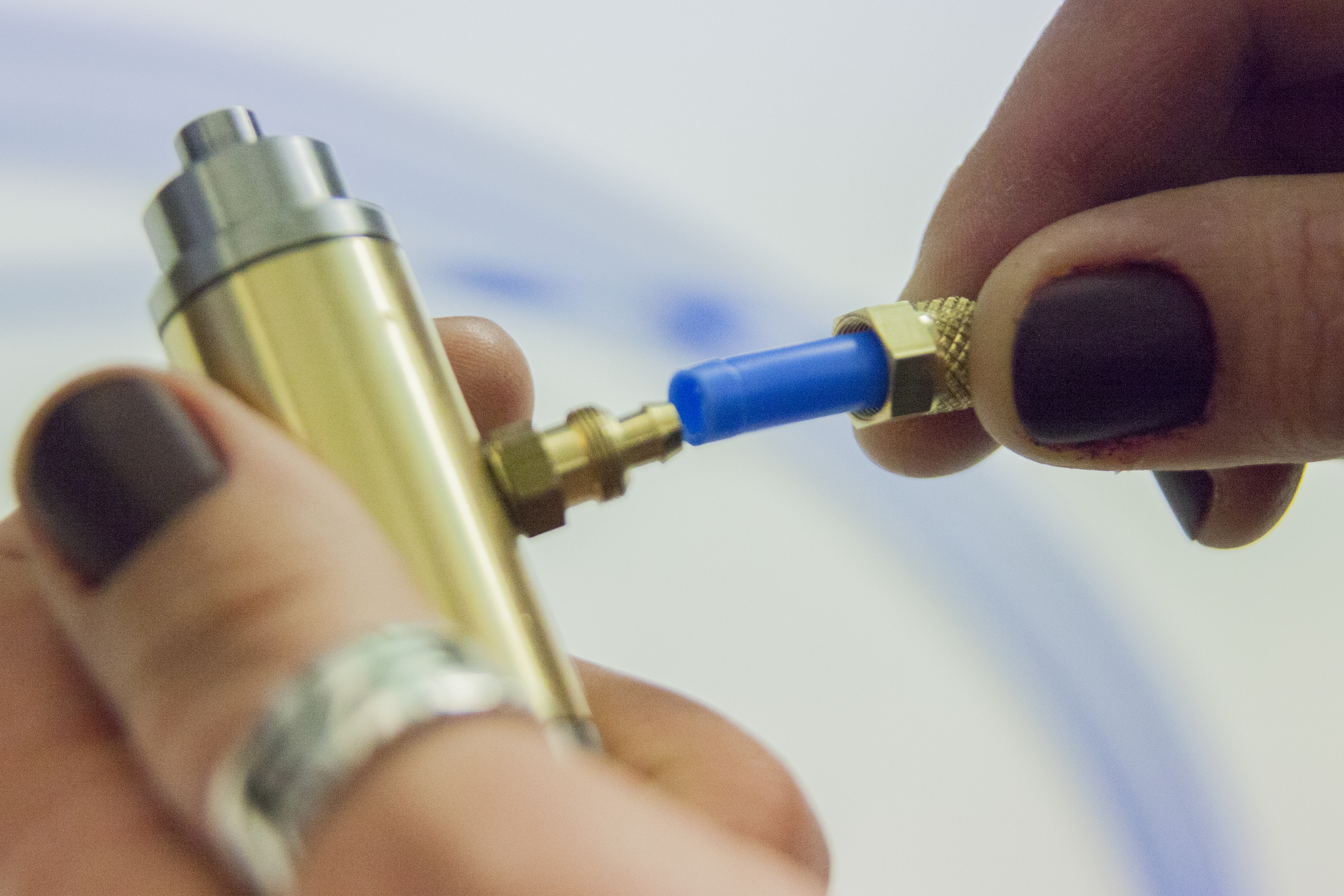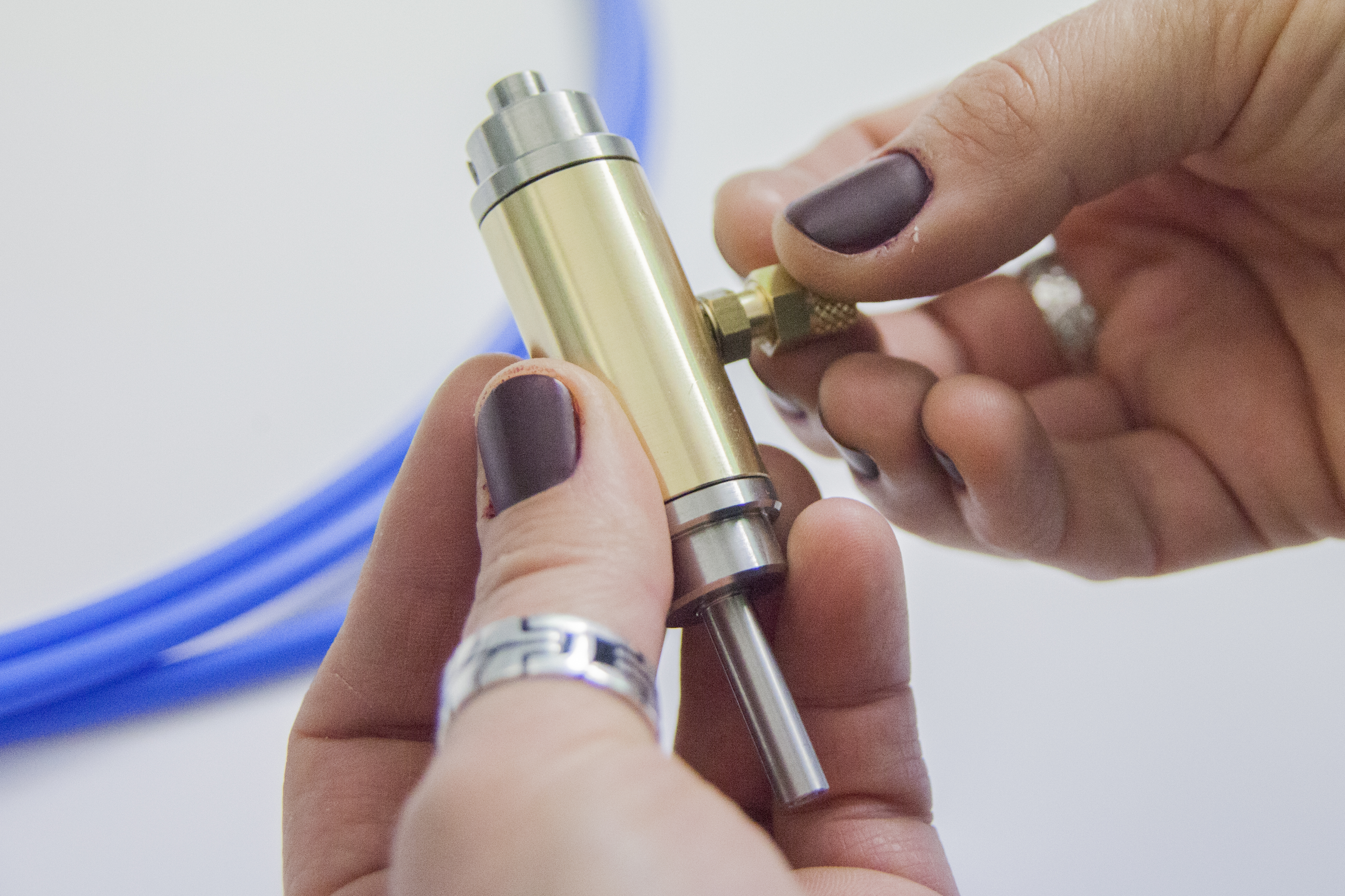 Now you can take a desired diamond drill. In this there is an ejection needle. Insert the drill with this ejector needle into the spindle. Press lightly upwards and let the thread „bite“. Tighten the drill bit to the end and, if necessary, carefully tighten the drill bit with pliers to the spindle.