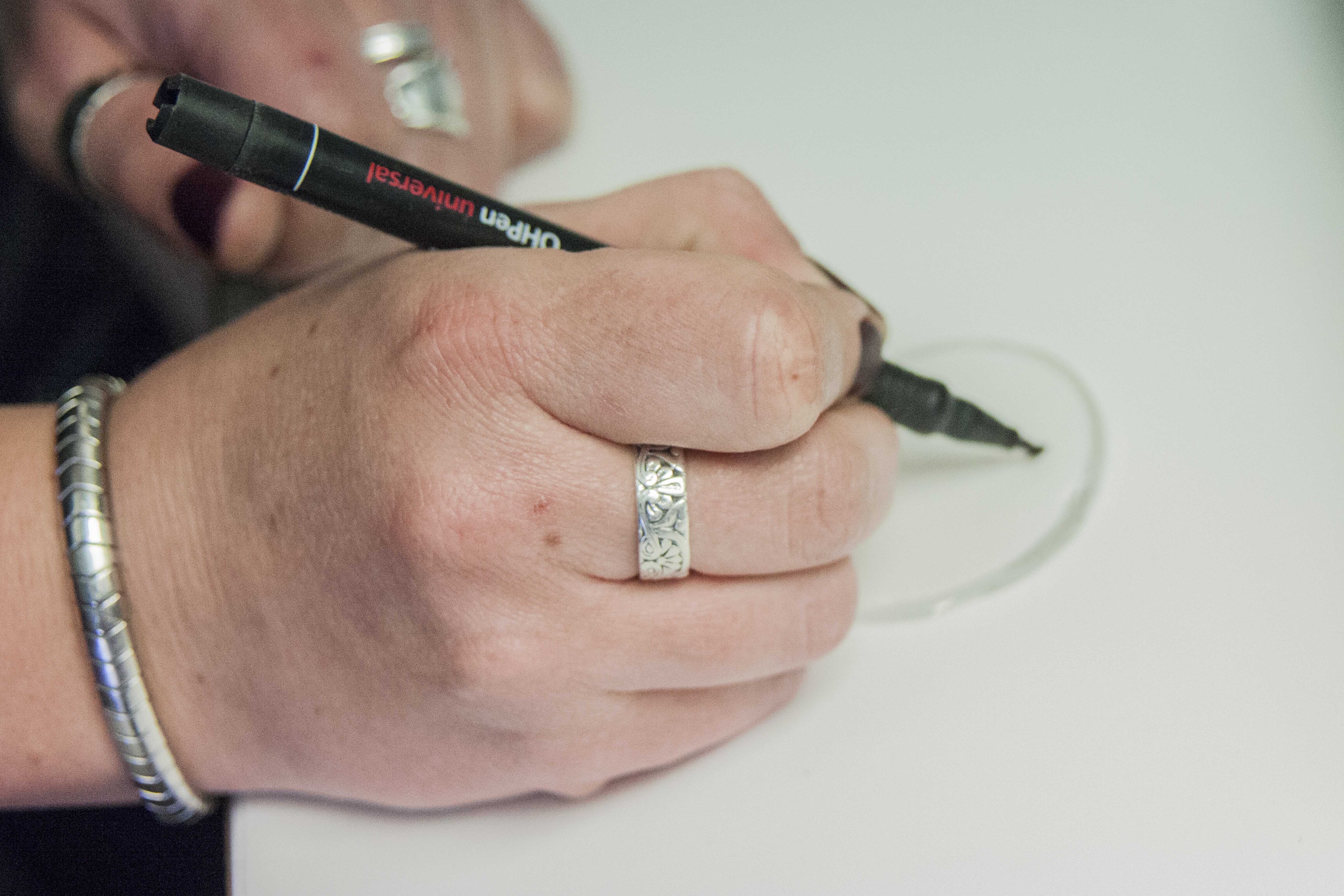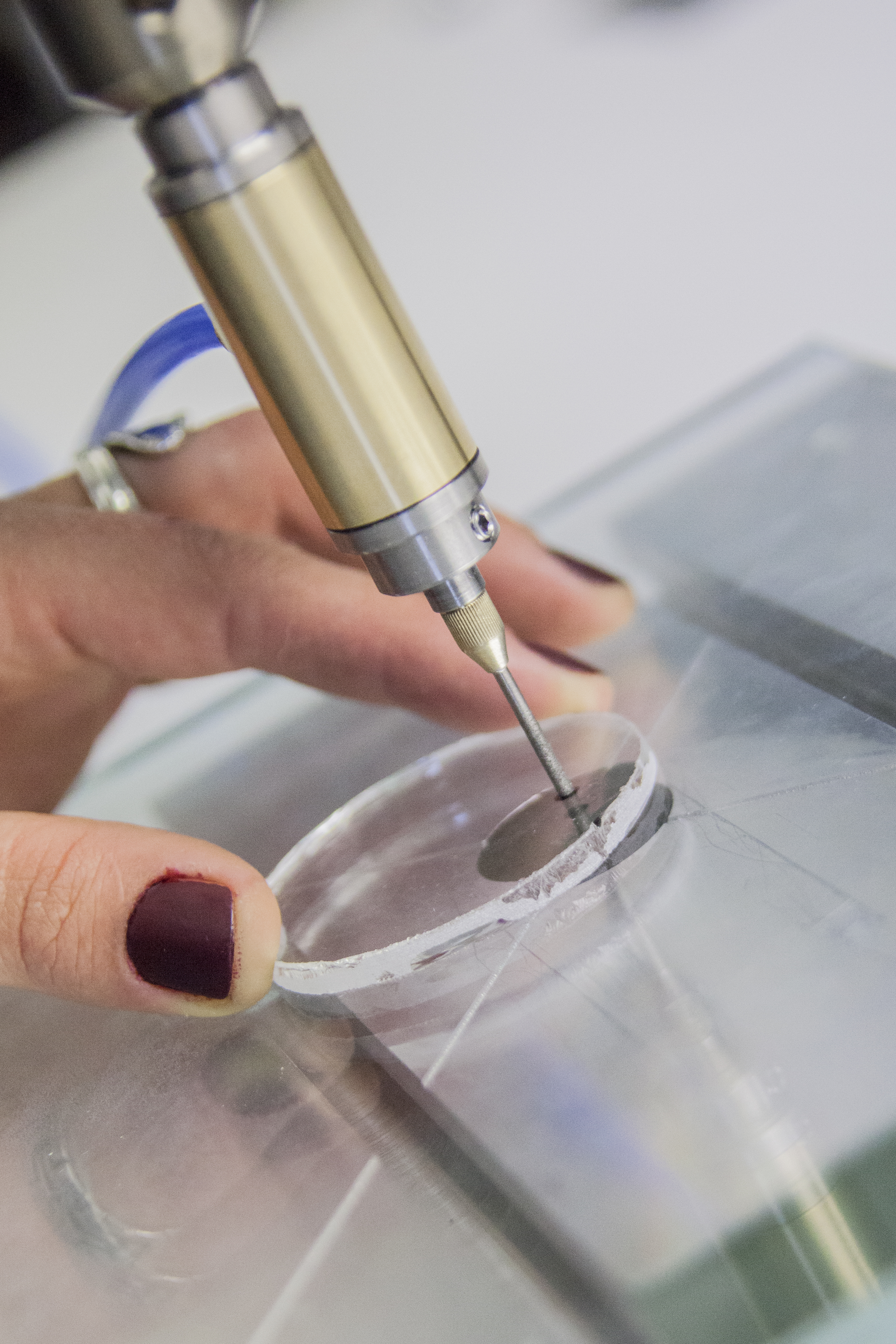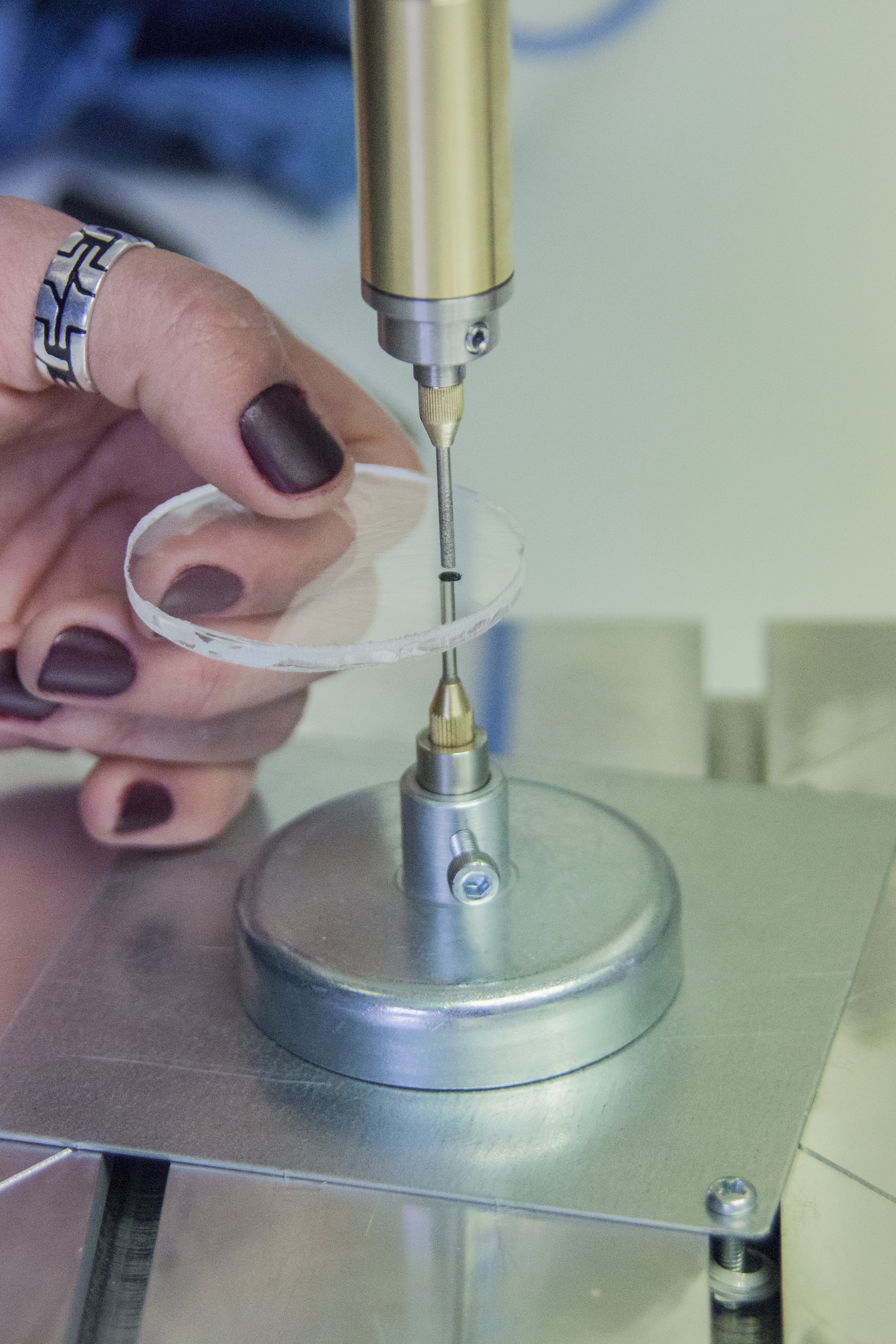 Now place the drilled glass piece with the drilled side on the counterpart and carefully drill further into it. The glass piece can not slip away.