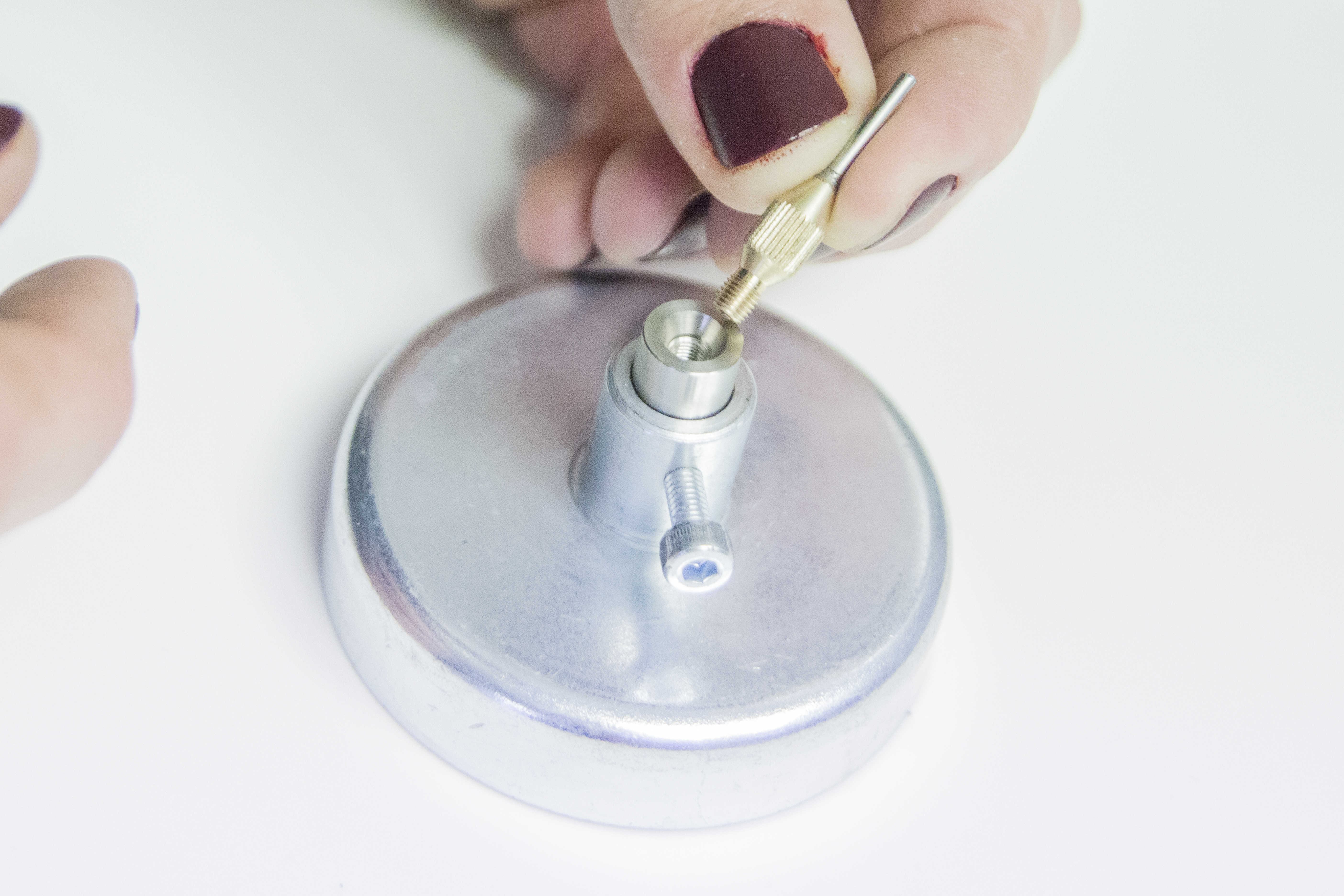Then the magnetic base with the counterpart must be aligned exactly under the drill. For machines that have a metal base you can put the magnetic base directly under the drill.